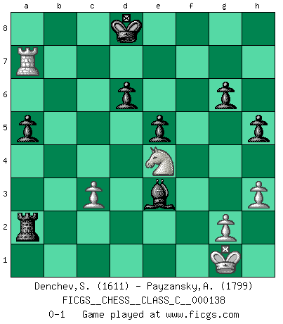 Last move : 0-1 2010 April 29 10:26:30 [Event "FICGS__CHESS__CLASS_C__000138"] [Site "FICGS"] [Date "2010.02.26"] [Round "1"] [White "Denchev,Stanimir"] [Black "Payzansky,Aleksey"] [Result "0-1"] [WhiteElo "1611"] [BlackElo "1799"] 1.e4 c5 2.Nf3 d6 3.Bc4 Nc6 4.c3 Nf6 5.d3 g6 6.O-O Bg7 7.h3 O-O 8.Be3 Na5 9.Bb5 Qb6 10.Na3 a6 11.Nc4 Nxc4 12.Bxc4 Qxb2 13.a4 Qb6 14.a5 Qc7 15.Qb3 Bd7 16.Rfb1 Rab8 17.Qb6 Qxb6 18.Rxb6 Bc6 19.Rab1 Nd7 20.R6b3 h6 21.Bd5 e6 22.Bxc6 bxc6 23.d4 Rb5 24.dxc5 Nxc5 25.Bxc5 Rxc5 26.Nd4 e5 27.Ne2 Rxa5 28.Rb6 Rc8 29.Rb8 Rxb8 30.Rxb8+ Bf8 31.Rb6 Ra1+ 32.Kh2 Ra2 33.Ng3 a5 34.Rxc6 Rxf2 35.Ra6 Ra2 36.Nf1 f5 37.Ne3 fxe4 38.Ra7 h5 39.Nd5 Bh6 40.Nf6+ Kf8 41.Nh7+ Ke8 42.Nf6+ Kd8 43.Nxe4 Bf4+ 44.Kg1 Be3+ 0-1 Sicilian Kingside Castling by player White (move 6) Kingside Castling by player Black (move 7) Player Black won this chess game. Follow this game move after move (download)Could we look into the head of a Chess player, we should see there a whole world of feelings, images, ideas, emotion and passion. (Alfred Binet) Ein Isolani verdüstert die Stimmung auf dem ganzen Schachbrett. (Savielly Grigorievitsch Tartakower) No nos podemos resistir a la fascinación de un sacrificio ya que la pasión por los sacrificios es parte de la naturaleza de un jugador de Ajedrez. (Rudolf Spielman) Il vaut toujours mieux jouer un plan faux de façon logique que de n'avoir pas de plan du tout. (Victor Kortchnoï) Experience is the name we all give to our mistakes. (Oscar Wilde)
