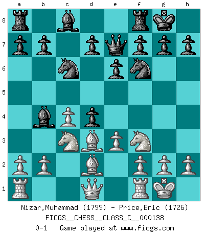 Last move : 0-1 2010 May 14 20:0:9 [Event "FICGS__CHESS__CLASS_C__000138"] [Site "FICGS"] [Date "2010.02.26"] [Round "1"] [White "Nizar,Muhammad"] [Black "Price,Eric"] [Result "0-1"] [WhiteElo "1799"] [BlackElo "1726"] 1.d4 Nf6 2.c4 e6 3.Nf3 Bb4+ 4.Bd2 Qe7 5.Nc3 c5 6.e3 Nc6 7.Bd3 O-O 8.O-O cxd4 0-1 This chess game has been lost on time (started : 2010.02.26 9:35:32) Bogo-Indian defense, Nimzovich variation Kingside Castling by player Black (move 7) Kingside Castling by player White (move 8) Player Black won this chess game. Follow this game move after move (download)Chess, like love, is infectious at any age. (Flohr) Frage: Was machen Sie mit den Preisen? Anwort: Ich habe Angst, dass meine Freundin davon neue Kleider kauft. (Loek van Wely) El Ajedrez es realmente noventa y nueve por ciento calculación. (Soltis) Je fais ceci parce que dans cinquante coups j'obtiendrai cela; je m'appelle Mikhail Moisevitch Botvinnik. (Botvinnik) Whatever you do, don't be bored. This is absolutely the most exciting time we could have possibly hoped to be alive. And things are just starting. (From movie Waking life)