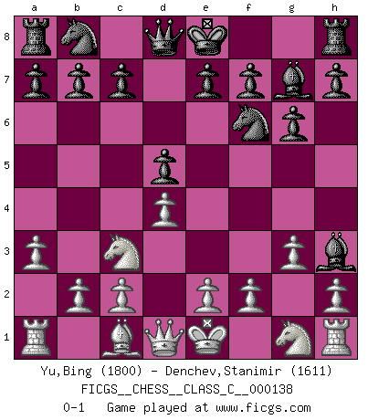 Last move : 0-1 2010 April 14 8:55:33 [Event "FICGS__CHESS__CLASS_C__000138"] [Site "FICGS"] [Date "2010.02.26"] [Round "1"] [White "Yu,Bing"] [Black "Denchev,Stanimir"] [Result "0-1"] [WhiteElo "1800"] [BlackElo "1611"] 1.d4 d5 2.Nc3 Nf6 3.a3 g6 4.g3 Bg7 5.Bh3 Bxh3 0-1 This chess game has been lost on time (started : 2010.02.26 9:35:32) Queen's pawn : Chigorin variation Player Black won this chess game. Follow this game move after move (download)Dazzling combinations are for the many, shifting wood is for the few. (Georg Kieninger) Das Schach hält seine Meister in eigenen Banden, Fesseln; auf vielerlei Weise formt es ihren Geist, so dass die innere Freiheit selbst des Stärksten beeinflusst wird. (Albert Einstein) Muchos se han convertido en Maestros de Ajedrez, nadie se ha convertido en el Maestro del Ajedrez. (Siegbert Tarrasch) C'est une question de caractère, Beaucoup de gens perdent leur motivation très vite. D'autres, ils sont rares, peuvent la conserver très longtemps. J'aime les échecs, encore aujourd'hui je suis heureux d'analyser des parties. J'aime toujours gagner, je déteste encore perdre. Bien jouer est important pour mon intégrité intellectuelle et morale. Et puis les échecs vivent en ce moment une période historique grâce à Internet. Ils se développent dans les systèmes éducatifs à travers le monde. Ils sortent de leur ghetto, et c'est mon rôle de mener à bien cette révolution. (Gary Kasparov) Employ the attack like tactic of defense. (Chinese proverb)
