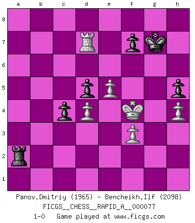 Last move : 1-0 2010 June 7 0:31:41 [Event "FICGS__CHESS__RAPID_A__000077"] [Site "FICGS"] [Date "2010.02.26"] [Round "1"] [White "Panov,Dmitriy"] [Black "Bencheikh,Ilf"] [Result "1-0"] [WhiteElo "1965"] [BlackElo "2098"] 1.e4 e6 2.d4 d5 3.e5 c5 4.c3 Nc6 5.Nf3 Qb6 6.a3 c4 7.Qc2 Na5 8.Nbd2 Bd7 9.Be2 Ne7 10.O-O Nc8 11.Bd1 Qc7 12.a4 Nb6 13.b4 cxb3 14.Nxb3 Nbc4 15.Nxa5 Nxa5 16.Ba3 Bxa3 17.Rxa3 b5 18.axb5 Bxb5 19.Re1 Nc4 20.Ra1 h6 21.Nd2 O-O 22.Nb3 a5 23.Qd3 Qc6 24.Bc2 g6 25.Qg3 Qe8 26.h4 a4 27.Nc5 h5 28.Reb1 a3 29.Ra2 Bc6 30.Rba1 Ra7 31.Bd3 Qa8 32.Qg5 Re8 33.Kh2 Qd8 34.Qxd8 Rxd8 35.Bxc4 dxc4 36.Rxa3 Rxa3 37.Rxa3 Rb8 38.Ra2 Rb1 39.Kg3 Rc1 40.Ra3 Rc2 41.f3 Rb2 42.Ra7 Rc2 43.Rc7 Bd5 44.Nd7 Rxc3 45.Kf4 Rc2 46.Nf6+ Kg7 47.g4 Ra2 48.Nxd5 exd5 49.gxh5 gxh5 50.Rd7 1-0 French : Advance, Paulsen attack Kingside Castling by player White (move 10) Kingside Castling by player Black (move 21) Player White won this chess game. Follow this game move after move (download)The game of chess is the touchstone of the intellect. (Goethe) Das Schach ist nichts für kleine Geister, es beansprucht einen vollen Mann, der sich nicht sklavisch an das Überlieferte hält, sondern selbständig die Tiefen des Spiels zu ergründen sucht. (Wilhelm Steinitz) Nunca antes ha habido un jugador de Ajedrez con tal conocimiento a fondo de las complejidades del juego y una inmensa voluntad absolutamente indomable de ganar. Yo pienso que Fischer es el jugador mas grande que jamás haya existido. (Lisa Lane) J'apprécie les joueurs d'est-indienne, c'est grâce à eux que je nourris ma famille depuis tant d'années. (Petrosian) If you don't practice you don't deserve to win. (Andre Agassi)