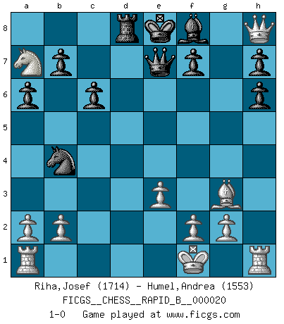 Last move : 1-0 2006 November 21 8:49:52 [Event "FICGS__CHESS__RAPID_B__000020"] [Site "FICGS"] [Date "2006.10.17"] [Round "1"] [White "Riha,Josef"] [Black "Humel,Andrea"] [Result "1-0"] [WhiteElo "1714"] [BlackElo "1553"] 1.d4 d5 2.c4 e5 3.dxe5 d4 4.Nf3 Nc6 5.Bf4 Nge7 6.h4 Ng6 7.Bg3 Qe7 8.h5 Ngxe5 9.Nxe5 Nxe5 10.Qxd4 Nc6 11.Qd2 Be6 12.Nc3 Rd8 13.Qc1 Bxc4 14.e3 Bxf1 15.Kxf1 Nb4 16.Nb5 c6 17.Nc7+ Kd7 18.Qc4 Kc8 19.h6 gxh6 20.Nb5 a6 21.Na7+ Kd7 22.Qd4+ Ke8 23.Qxh8 1-0 QGD : Albin counter-gambit Player White won this chess game. Follow this game move after move (download)White lost because he failed to remember the right continuation and had to think up the moves himself. (Siegbert Tarrasch) Wer der Ansicht ist, daß alle Schachspieler verrückt sind, wird durch Studium des Lebens von Emil Josef Diemer nicht auf andere Gedanken kommen. (Hans Ree) El Ajedrez tiene tanto misterio como las mujeres. (Purdy) Echiquier : carré parfait, comme la Jérusalem nouvelle décrite par l'auteur de l'Apocalypse, huit cases sur huit, exaltation du chiffre 4, symbole du cosmos aux quatre horizons... où le noir et le blanc, l'ombre et la lumière, le mal et le bien s'entremêlent et se conjuguent. (Robert Couffignal, Le Gambit du poète) All the biggest technological inventions created by man - the airplane, the automobile, the computer - says little about his intelligence, but speaks volumes about his laziness. (Mark Kennedy)