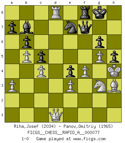 Last move : 1-0 2010 April 18 14:57:15 [Event "FICGS__CHESS__RAPID_A__000077"] [Site "FICGS"] [Date "2010.02.26"] [Round "1"] [White "Riha,Josef"] [Black "Panov,Dmitriy"] [Result "1-0"] [WhiteElo "2034"] [BlackElo "1965"] 1.c4 Nf6 2.d4 e6 3.Nf3 Bb4+ 4.Nbd2 O-O 5.a3 Bxd2+ 6.Bxd2 d6 7.Qc2 Qe7 8.Bc3 Nbd7 9.e3 e5 10.Be2 b6 11.O-O Bb7 12.b4 h6 13.dxe5 dxe5 14.Nd2 Ne8 15.Rfd1 Nd6 16.Rac1 c5 17.Nf1 Rad8 18.f3 Bc6 19.Rd2 f5 20.Rcd1 Nf6 21.Ng3 g6 22.Nh1 e4 23.f4 Rd7 24.b5 Bb7 25.h3 Bc8 26.g4 R7d8 27.Ng3 fxg4 28.Bxf6 Qxf6 29.hxg4 Bb7 30.Kg2 Kg7 31.Qa4 Nc8 32.Rd7+ Rxd7 33.Rxd7+ Rf7 34.Rd2 Kg8 35.Qd1 Rf8 36.Kh3 Qg7 37.Bf1 Qf6 38.Bg2 h5 39.g5 Qe6+ 40.Kh4 Ne7 41.Bh3 Qf7 42.Rd8 1-0 English, 1...Nf6 (Anglo-Indian defense) Kingside Castling by player Black (move 4) Kingside Castling by player White (move 11) Player White won this chess game. Follow this game move after move (download)It was clear to me that the vulnerable point of the American Grandmaster (Bobby Fischer) was in double-edged, hanging, irrational positions, where he often failed to find a win even in a won position. (Efim Geller) Es ist wirklich schade, dass so viele Schachspieler nicht auf ihr Äußeres achten! (Alexandra Kosteniuk) El Ajedrez es una manera fabulosa para que los niños aprendan a autovalorarse y a autoestimarse. (Saudin Robovic) Des points faibles ou des trous dans la position de l'adversaire doivent être occupés par des pièces et non pas par des pions. (Siegbert Tarrasch) All politicians must be presumed guilty until they are proven innocent. (Dinesh De Silva)