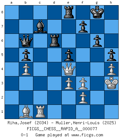 Last move : 0-1 2010 March 16 17:36:35 [Event "FICGS__CHESS__RAPID_A__000077"] [Site "FICGS"] [Date "2010.02.26"] [Round "1"] [White "Riha,Josef"] [Black "Muller,Henri-Louis"] [Result "0-1"] [WhiteElo "2034"] [BlackElo "2025"] 1.c4 Nf6 2.d4 e6 3.Nf3 d5 4.Nc3 Nbd7 5.Bg5 Be7 6.e3 O-O 7.Rc1 c6 8.Qc2 a6 9.a3 Re8 10.h3 h6 11.Bh4 dxc4 12.Bxc4 b5 13.Ba2 c5 14.dxc5 Nxc5 15.O-O Bb7 16.Rfd1 Qb6 17.Bxf6 Bxf6 18.b4 Bxf3 19.gxf3 Nb7 20.Ne4 Bh4 21.Kg2 a5 22.Rd7 Rad8 23.Rc7 axb4 24.Bb1 g6 25.axb4 Nd6 26.Nxd6 Rxd6 27.Qe4 Bf6 28.h4 h5 29.Qf4 e5 30.Qe4 Bd8 31.Kh3 Bxc7 0-1 English, 1...Nf6 (Anglo-Indian defense) Kingside Castling by player Black (move 6) Kingside Castling by player White (move 15) Player Black won this chess game. Follow this game move after move (download)You need not play well - just help your opponent to play badly. (Genrikh Chepukaitis) Ich verachte Kasparow. (Viktor Kortschnoi) Un Peón pasado es un criminal, quién debe ser mantenido bajo candado y llave. Leves medidas, tales como vigilancia policiaca, no son suficientes. (Aaron Nimzovich) Donnez-moi un Cavalier en 6e et je gagnerais toutes mes parties. (Steinitz) History is a gallery of pictures in which there are few originals and many copies. (Alexis de Tocqueville)