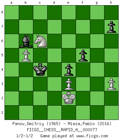 Last move : 1/2-1/2 2010 April 1 18:13:36 [Event "FICGS__CHESS__RAPID_A__000077"] [Site "FICGS"] [Date "2010.02.26"] [Round "1"] [White "Panov,Dmitriy"] [Black "Mieza,Pablo"] [Result "1/2-1/2"] [WhiteElo "1965"] [BlackElo "2016"] 1.e4 c5 2.c3 d5 3.exd5 Qxd5 4.d4 Nc6 5.dxc5 Qxd1+ 6.Kxd1 e5 7.Be3 Nf6 8.Nf3 Nd5 9.b4 f6 10.Bc4 Be6 11.Bxd5 Bxd5 12.Nbd2 a5 13.b5 Ne7 14.c4 Be6 15.Ne4 Nf5 16.Nfd2 O-O-O 17.Kc2 Nxe3+ 18.fxe3 Kb8 19.Rhd1 Rc8 20.c6 bxc6 21.Rdb1 Ka7 22.Rb2 Bf5 23.a3 cxb5 24.Rxb5 Ka6 25.Rab1 Bc5 26.g4 Bg6 27.Kd3 Rhd8+ 28.Ke2 Rxd2+ 29.Nxd2 Bxb1 30.Nxb1 e4 31.Rb3 g6 32.Nd2 a4 33.Rb1 f5 34.gxf5 gxf5 35.Rf1 Rf8 36.Nb1 Be7 37.Kd2 Kb6 38.Nc3 Kc5 39.Nxa4+ Kxc4 40.Nb6+ Kb5 41.Rb1+ Kc6 42.Nc4 Rd8+ 43.Ke2 Kd5 44.Rb7 Bf8 45.Na5 Rc8 46.Rb5+ Rc5 47.a4 Rxb5 48.axb5 Bc5 49.h3 Bb4 50.Nc6 Bc5 51.Na5 Bb6 52.Nc6 Kc4 1/2-1/2 Sicilian : Alapin's variation (2.c3) Queenside Castling by player Black (move 16) 10 pieces endgame at move 48 : White KNPPP , Black KBPPP WHITE : King + 1 Knight 3 Pawns BLACK : King + 1 Bishop 3 Pawns This chess game ended in a draw. Follow this game move after move (download)The tactician knows what to do when there is something to do; whereas the strategian knows what to do when there is nothing to do. (Gerald Abrahams) Der Bart als Geschlechtszeichen mitten im Gesicht ist obszön. Daher gefällt er den Weibern. [Zugegeben, kein Schachzitat, aber unglaublich originell] (Arthur Schopenhauer) El juego de Damas es para vagabundos. (Paul Morphy) Lorsque vous vous retrouvez devant une position atroce, ne tendez pas un ultime piège dérisoire avec l'intention d'abandonner si l'adversaire le déjoue ! Faites-vous plutôt un devoir de résister comme si votre vie en dépendait. Jouez le coup qui vous déplairait au centuple si vous étiez dans la peau de votre tortionnaire ! For a mechanic, you seem to do an excessive amount of thinking. (C-3PO in Star Wars ep.2)