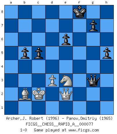 Last move : 1-0 2010 May 24 11:4:15 [Event "FICGS__CHESS__RAPID_A__000077"] [Site "FICGS"] [Date "2010.02.26"] [Round "1"] [White "Archer,J. Robert"] [Black "Panov,Dmitriy"] [Result "1-0"] [WhiteElo "1996"] [BlackElo "1965"] 1.Nf3 Nf6 2.c4 e6 3.Nc3 Bb4 4.Qc2 O-O 5.a3 Bxc3 6.Qxc3 d5 7.e3 Nbd7 8.b4 a5 9.Bb2 Nb6 10.cxd5 axb4 11.axb4 Rxa1+ 12.Bxa1 Nbxd5 13.Qb3 b6 14.b5 Bb7 15.Be2 Qe7 16.O-O Ra8 17.Rc1 Ne4 18.Qc2 Nd6 19.Bb2 Ra2 20.Ne5 Ra8 21.Bf1 Qh4 22.f3 f5 23.Bd4 Qe7 24.e4 fxe4 25.fxe4 Qh4 26.d3 Nxb5 27.Bb2 c5 28.exd5 Nd4 29.g3 Qd8 30.Bxd4 Qxd5 31.Bb2 Qh1+ 32.Kf2 Rf8+ 33.Ke3 Qg1+ 34.Kd2 Qxh2+ 35.Be2 Qh6+ 36.Kc3 Qf6 37.Kb3 Bd5+ 38.Nc4 Qg5 39.Kc3 b5 40.Qd2 Qxg3 41.Ne3 Bf3 42.Rf1 h5 43.Kc2 Bxe2 44.Rxf8+ Kxf8 45.Qxe2 1-0 Reti Opening Kingside Castling by player Black (move 4) Kingside Castling by player White (move 16) Player White won this chess game. Follow this game move after move (download)Chess is the gymnasium of the mind. (Blaise Pascal) Ich bin stolz ein Bulgare zu sein. (Veselin Topalov) El Ajedrez por encima de todo... ¡es una pelea!. (Emanuel Lasker) Le système Elo représente seulement une moyenne. Il est simplement un indicateur de votre stabilité. (Anatoli Karpov) Ah, beer! The cause of, and the solution to, all of life's problems. (Homer Simpson)