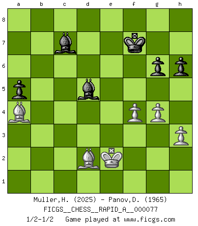 Last move : 1/2-1/2 2010 March 12 18:6:51 [Event "FICGS__CHESS__RAPID_A__000077"] [Site "FICGS"] [Date "2010.02.26"] [Round "1"] [White "Muller,Henri-Louis"] [Black "Panov,Dmitriy"] [Result "1/2-1/2"] [WhiteElo "2025"] [BlackElo "1965"] 1.e4 e5 2.Nf3 Nf6 3.Nxe5 d6 4.Nf3 Nxe4 5.d4 d5 6.Bd3 Bd6 7.O-O O-O 8.c4 c6 9.cxd5 cxd5 10.Nc3 Nxc3 11.bxc3 h6 12.Rb1 Re8 13.h3 Nc6 14.Re1 Rxe1+ 15.Qxe1 Qe7 16.Bd2 Qxe1+ 17.Rxe1 Bd7 18.Ne5 Nxe5 19.dxe5 Bc5 20.Kf1 Be6 21.f4 d4 22.cxd4 Bxd4 23.a3 Rd8 24.Ke2 Bd5 25.g4 f6 26.exf6 Re8+ 27.Kf1 Rxe1+ 28.Kxe1 Bxf6 29.Kf2 Kf7 30.a4 b6 31.a5 Bd8 32.axb6 Bxb6+ 33.Ke2 a5 34.Bb5 g6 35.Ba4 Bc7 1/2-1/2 Petrov : Classical attack, Marshall variation Kingside Castling by player White (move 7) Kingside Castling by player Black (move 7) This chess game ended in a draw. Follow this game move after move (download)Who is your opponent tonight, tonight I am playing against the Black pieces. (Akiba Rubinstein) Gewinnen beim Schach fördert das Selbstvertrauen. Beim Sex spüre ich sowas nicht... (Garry Kasparov) La caracteristica mas importante en la posición del Ajedrez es la actividad de las piezas. Esto es absolutamente fundamental en todas las fases del juego: Apertura, Juego Medio y especialmente Finales. La limitación primordial en la actividad de una pieza, es la estructuración de los Peones. (Michael Stean) Les échecs sont plus proches de l'art de l'assassinat que de l'art de la guerre. (Arturo Perez-Reverte) All war is based on deception. (Sun Tzu)