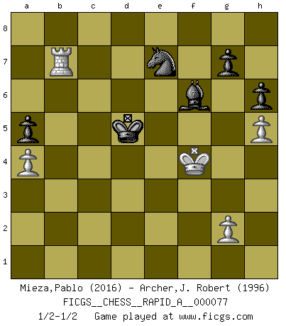 Last move : 1/2-1/2 2010 August 9 3:21:12 [Event "FICGS__CHESS__RAPID_A__000077"] [Site "FICGS"] [Date "2010.02.26"] [Round "1"] [White "Mieza,Pablo"] [Black "Archer,J. Robert"] [Result "1/2-1/2"] [WhiteElo "2016"] [BlackElo "1996"] 1.d4 d5 2.Nf3 Nf6 3.c4 e6 4.Nc3 c6 5.e3 Nbd7 6.Bd3 dxc4 7.Bxc4 b5 8.Be2 Bb7 9.O-O a6 10.e4 c5 11.e5 Nd5 12.a4 b4 13.Ne4 Qc7 14.Qd3 h6 15.Be3 Nxe3 16.fxe3 Be7 17.Rac1 O-O 18.Ned2 a5 19.b3 Ba6 20.Nc4 Nb6 21.Qe4 Bb7 22.Qg4 Nd5 23.Bd3 Nc3 24.Rc2 cxd4 25.Nxd4 Bd5 26.Qg3 Rac8 27.Rcf2 Be4 28.Bc2 Qd8 29.Qg4 Bxc2 30.Rxc2 Rxc4 31.bxc4 Qc7 32.Nxe6 fxe6 33.Qxe6+ Kh7 34.Rxf8 Bxf8 35.Rf2 Be7 36.h4 Bc5 37.Rf7 Qd8 38.Qg4 Qd1+ 39.Qxd1 Nxd1 40.e6 Nxe3 41.Rc7 Bd4 42.Kh1 Kg6 43.Rf7 b3 44.h5+ Kg5 45.Rb7 Kf6 46.e7 Kf7 47.Rxb3 Kxe7 48.c5 Ke6 49.c6 Nd5 50.Rd3 Be5 51.Rd1 Bc7 52.Rd4 Bg3 53.Rd3 Bb8 54.Kg1 Be5 55.Rd1 Bc7 56.Rd3 Nb4 57.Rd7 Be5 58.Kf2 Nxc6 59.Rb7 Kd5 60.Ke3 Bd4+ 61.Kf4 Bf6 62.Kf5 Ne7+ 63.Kf4 1/2-1/2 Queen's pawn game Kingside Castling by player White (move 9) Kingside Castling by player Black (move 17) This chess game ended in a draw. Follow this game move after move (download)I thought the most common mistake [in chess] was the first one: Learning the game :P (Garvin Gray, FICGS forum) Schach ist ein Teil der Kultur, und wenn es mit der Kultur abwärts geht, geht es auch mit dem Schach abwärts. (Mikhail Moiseyevich Botvinik) Debes de llevar a tu oponente hacia un profundo y obscuro bosque donde 2+2=5, y el camino que conduce a la salida es suficientemente ancho para solamente uno. (Mikhail Tal) Nous sommes les pions de la mystérieuse partie d'Echecs jouée par Dieu. Il nous déplace, nous arrête, nous pousse encore, puis nous lance un à un dans la boîte du Néant. Epitaphe sur la tombe de David Janowsky (1868-1927). Hello Thibault, if I have had a plan (and I had one, I hope), I have forgotten it during the last week... - Hello Heinz-Georg. What do you mean a plan ? (Anonymous players, during a Big Chess game)