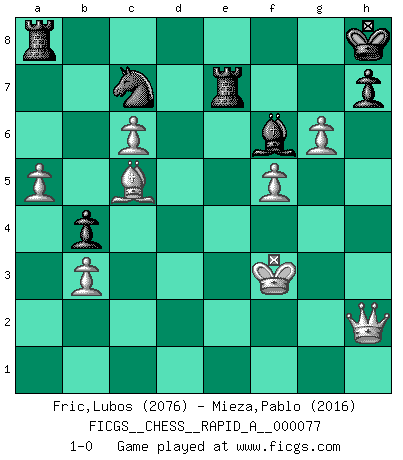 Last move : 1-0 2010 March 28 19:59:35 [Event "FICGS__CHESS__RAPID_A__000077"] [Site "FICGS"] [Date "2010.02.26"] [Round "1"] [White "Fric,Lubos"] [Black "Mieza,Pablo"] [Result "1-0"] [WhiteElo "2076"] [BlackElo "2016"] 1.d4 Nf6 2.c4 c5 3.d5 g6 4.Nc3 Bg7 5.e4 d6 6.Nf3 O-O 7.h3 Nfd7 8.Be2 Ne5 9.Nh2 e6 10.O-O exd5 11.cxd5 f5 12.exf5 Bxf5 13.Ng4 Nxg4 14.hxg4 Bd7 15.Qb3 Na6 16.g3 Re8 17.Be3 Bd4 18.Bh6 b5 19.Qc2 Rb8 20.Rad1 Nc7 21.Bf3 Qe7 22.Rfe1 Qxe1+ 23.Rxe1 Rxe1+ 24.Kg2 Re7 25.Ne4 Ne8 26.Bg5 Rg7 27.Bf4 Rb6 28.Ng5 Re7 29.Ne6 Bf6 30.g5 Bg7 31.Nd8 b4 32.Nc6 Rf7 33.Qb3 Bf8 34.Nxa7 Nc7 35.Nc6 Ra6 36.a4 Ra8 37.Be4 Bc8 38.f3 Rd7 39.Bd3 Bb7 40.a5 Rf7 41.Bc4 Kg7 42.Be3 Kh8 43.Qd3 Bg7 44.b3 Rf5 45.g4 R5f8 46.Kg3 Rae8 47.f4 Ra8 48.f5 Bxc6 49.dxc6 Be5+ 50.Kf3 gxf5 51.gxf5 d5 52.Bxd5 Rfd8 53.g6 Rxd5 54.Qe4 Bf6 55.Qf4 Re5 56.Qh2 Re7 57.Bxc5 1-0 Benoni defense Kingside Castling by player Black (move 6) Kingside Castling by player White (move 10) Player White won this chess game. Follow this game move after move (download)By the beauty of his games, the clarity of his play, and the brilliance of his ideas, Fischer made himself an artist of the same stature as Brahms, Rembrandt, and Shakespeare. (David Levy) Mein Name ist Rustam Kamsky. Sie haben meinen Sohn belästigt. Bereiten Sie sich aufs Sterben vor. (Rustam Kamsky) Yo siempre he tenido un ligero sentimiento de lástima por una persona que no tiene conocimiento del Ajedrez. (Siegbert Tarrasch) En blitz, le Cavalier l'emporte sur le Fou. (Vlastimil Hort) Success without honor is an unseasoned dish; it will satisfy your hunger, but it won't taste good. (Joe Paterno)