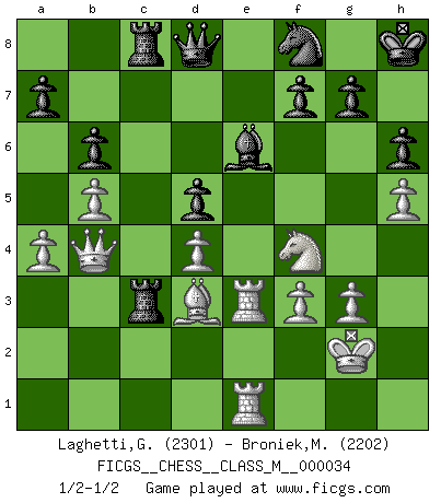 Last move : 1/2-1/2 2011 January 26 12:56:51 [Event "FICGS__CHESS__CLASS_M__000034"] [Site "FICGS"] [Date "2010.02.27"] [Round "1"] [White "Laghetti,Gaetano"] [Black "Broniek,Mariusz Maciej"] [Result "1/2-1/2"] [WhiteElo "2301"] [BlackElo "2202"] 1.d4 Nf6 2.c4 e6 3.Nc3 Bb4 4.e3 c5 5.Bd3 Nc6 6.Nge2 cxd4 7.exd4 d5 8.cxd5 Nxd5 9.O-O O-O 10.Nxd5 exd5 11.a3 Bd6 12.Bf4 Bg4 13.f3 Be6 14.Bxd6 Qxd6 15.Re1 Qc7 16.Qc2 h6 17.b4 Rac8 18.Qd2 Rfe8 19.Rac1 Qd6 20.g3 Bd7 21.Kf2 Qf6 22.Bb1 Kf8 23.Ba2 Ne7 24.Nc3 Qd6 25.Re3 Kg8 26.Rce1 Be6 27.Na4 b6 28.Nc3 Qd7 29.Bb1 Rc7 30.h4 Rec8 31.Ne2 Ng6 32.h5 Nf8 33.Nf4 Rc6 34.b5 Rc4 35.Bd3 R4c7 36.Qb4 Qd8 37.a4 Kh8 38.Kg2 Rc3 1/2-1/2 Nimzo-Indian : 4.e3 c5 Kingside Castling by player White (move 9) Kingside Castling by player Black (move 9) This chess game ended in a draw. Follow this game move after move (download)The passion for playing Chess is one of the most unaccountable in the world. (H.G. Wells) Frage: Was machen Sie mit den Preisen? Anwort: Ich habe Angst, dass meine Freundin davon neue Kleider kauft. (Loek van Wely) Solo existe una cosa que Fischer hace en el Ajedrez sin placer: ¡perder!. (Boris Spassky) Votre seul travail dans les ouvertures est d'obtenir un milieu de partie jouable. (Lajos Portish) There are two major products that came out of Berkeley: LSD and UNIX. We do not believe this is to be a coincidence. (Jeremy S. Anderson)
