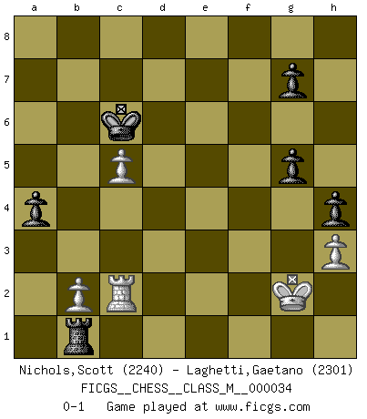 Last move : 0-1 2010 May 6 17:56:15 [Event "FICGS__CHESS__CLASS_M__000034"] [Site "FICGS"] [Date "2010.02.27"] [Round "1"] [White "Nichols,Scott"] [Black "Laghetti,Gaetano"] [Result "0-1"] [WhiteElo "2240"] [BlackElo "2301"] 1.e4 c5 2.Nf3 d6 3.d4 cxd4 4.Nxd4 Nf6 5.Nc3 a6 6.Be2 e5 7.Nb3 Be7 8.O-O O-O 9.Qd3 Be6 10.f4 b5 11.Qg3 Re8 12.f5 Bc8 13.Bh6 Bf8 14.a3 Bb7 15.Bg5 Nbd7 16.Nd2 Bc6 17.Kh1 Qb6 18.Bd3 a5 19.Rfe1 Rec8 20.a4 bxa4 21.Nc4 Qb7 22.h3 Rcb8 23.Re2 Re8 24.Qf3 h6 25.Bh4 Rec8 26.Bxf6 Nxf6 27.Qe3 Re8 28.Nb6 Rad8 29.Bc4 Nxe4 30.Nxe4 d5 31.Bxd5 Bxd5 32.Nxd5 Rxd5 33.Nc3 Rd4 34.Nxa4 Rf4 35.Qb6 Qd7 36.Nc3 a4 37.Qb5 Qxb5 38.Nxb5 Rc8 39.g4 f6 40.c3 R8c4 41.Rd1 h5 42.g5 fxg5 43.Rxe5 Rc5 44.Rxc5 Bxc5 45.Rd8+ Kf7 46.Rd2 Rxf5 47.Nd6+ Bxd6 48.Rxd6 Rf1+ 49.Kg2 Rb1 50.Rd2 Ke6 51.Rc2 h4 52.c4 Kd6 53.c5+ Kc6 0-1 Sicilian : Najdorf, Opovcensky variation Kingside Castling by player White (move 8) Kingside Castling by player Black (move 8) Player Black won this chess game. Follow this game move after move (download)The Pin is mightier than the sword. (Fred Reinfeld) Im Blitz ist es einfacher mit einer Figur weniger anzugreifen, als sich mit einer Mehrfigur zu verteidigen. (Mikhail Nekhemyevich Tal) Si pudieramos observar el interior de la cabeza de un jugador de Ajedrez, encontraríamos ahí un mundo lleno de sentimientos, imágenes, ideas, emoción y pasión. (Alfred Binet) Le pion, dans sa simplicité, marche droit devant lui, mais lorsqu'il prend, il le fait obliquement? Ainsi l'homme, tant qu'il reste pauvre, marche dans la droiture et vit honnêtement, mais lorsqu'il recherche les honneurs, il flatte, se parjure et, par les voies obliques, cherche une position supérieure sur l'échiquier du monde. (Jean de Galles) We're missing something. (Gregory House, House M.D.)