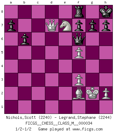 Last move : 1/2-1/2 2010 August 31 17:38:3 [Event "FICGS__CHESS__CLASS_M__000034"] [Site "FICGS"] [Date "2010.02.27"] [Round "1"] [White "Nichols,Scott"] [Black "Legrand,Stephane"] [Result "1/2-1/2"] [WhiteElo "2240"] [BlackElo "2244"] 1.e4 e5 2.Nf3 Nf6 3.Nc3 Nc6 4.Bb5 Nd4 5.Bc4 Bc5 6.Nxe5 d5 7.Bxd5 Nxd5 8.Nxd5 O-O 9.d3 Re8 10.c3 Rxe5 11.cxd4 Bxd4 12.O-O c6 13.Nf4 b6 14.Qa4 Rb5 15.Rb1 Qd6 16.Ne2 Be5 17.f4 Bf6 18.Rf3 Bg4 19.e5 Qd7 20.exf6 Bxf3 21.gxf3 Re8 22.Qc2 Rh5 23.Qd2 Rh6 24.Ng3 Rxf6 25.b4 Rd6 26.Rb3 Rd8 27.Qc2 Rxd3 28.Rxd3 Qxd3 29.Qxc6 Qd4+ 30.Kg2 Qxb4 31.Be3 Qa3 32.Qc7 Rf8 33.Bf2 Qxa2 34.Nf5 Qe6 35.Ne7+ Kh8 36.f5 Qf6 37.Qd7 1/2-1/2 Petrov Three knights game Kingside Castling by player Black (move 8) Kingside Castling by player White (move 12) This chess game ended in a draw. Follow this game move after move (download)Discovered check is the dive bomber of the Chessboard. (Reuben Fine) Wenn Spassky eine Figur opfert kannst du genauso gut aufgeben. Aber wenn Tal eine Figur opfert, spiel weiter. Er könnte noch eine weitere opfern, und dann ... wer weiß? (Miguel Najdorf) Todavía soy una víctima del Ajedrez. Tiene toda la belleza del arte y mucho mas. No puede ser comercializado. El Ajedrez es mas puro que el arte en su posición social. (Marcel Duchamp) On n'a jamais que l'âge auquel on a commence à jouer aux échecs car après on cesse de vieillir. (Capablanca) You lose, general Kenobi. (General Grievous in Star Wars ep.3)