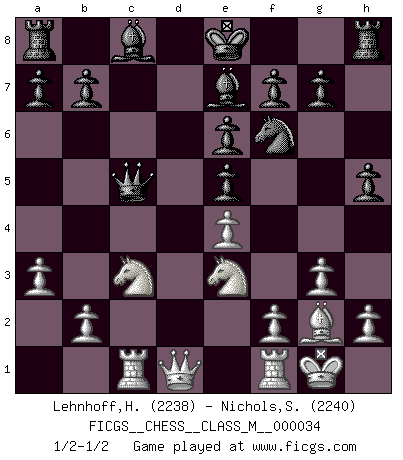 Last move : 1/2-1/2 2010 May 22 2:17:52 [Event "FICGS__CHESS__CLASS_M__000034"] [Site "FICGS"] [Date "2010.02.27"] [Round "1"] [White "Lehnhoff,Heinz-Georg"] [Black "Nichols,Scott"] [Result "1/2-1/2"] [WhiteElo "2238"] [BlackElo "2240"] 1.d4 Nf6 2.c4 c5 3.Nf3 cxd4 4.Nxd4 Nc6 5.Nc3 e6 6.g3 Qb6 7.Nb3 h5 8.Bg2 Qb4 9.Bf4 Qxc4 10.Rc1 Qb4 11.e4 d6 12.O-O Be7 13.a3 Qb6 14.Nd2 Ne5 15.Bxe5 dxe5 16.Nc4 Qc5 17.Ne3 Qa5 18.Nc4 Qc5 19.Ne3 1/2-1/2 Benoni defense Kingside Castling by player White (move 12) This chess game ended in a draw. Follow this game move after move (download)Chess is a sea in which a gnat may drink and an elephant may bathe. (Hindu proverb) Über Frauen: Chess is better. (Robert James Fischer) Un entendimiento a fondo de las continuaciones típicas del mate, hace de las combinaciones de sacrificio mas complicadas conducirlas a ellas no solo sin dificultad, sino casi de una manera natural. (Siegbert Tarrasch) Un footballeur joue avec ses pieds, parfois avec sa tête. Un joueur d'échecs ne joue qu'avec sa tête. Et quand il ne joue plus, il meurt. (Jacob Murray) A bird doesn't sing because it has an answer, it sings because it has a song. (Maya Angelou)