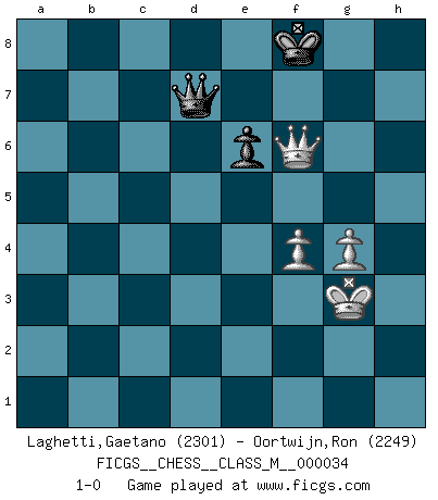 Last move : 1-0 2010 May 28 10:52:10 [Event "FICGS__CHESS__CLASS_M__000034"] [Site "FICGS"] [Date "2010.02.27"] [Round "1"] [White "Laghetti,Gaetano"] [Black "Oortwijn,Ron"] [Result "1-0"] [WhiteElo "2301"] [BlackElo "2249"] 1.d4 Nf6 2.c4 e6 3.Nc3 d5 4.Nf3 Bb4 5.Bg5 dxc4 6.e4 c5 7.Bxc4 cxd4 8.Nxd4 Bxc3+ 9.bxc3 Qa5 10.Bxf6 Qxc3+ 11.Kf1 gxf6 12.Rc1 Qa5 13.h4 Ke7 14.Rh3 Nc6 15.Nxc6+ bxc6 16.Rd3 Rd8 17.Rxd8 Qxd8 18.Qa4 Qd6 19.Rd1 Qc7 20.Qa3+ c5 21.Rc1 Bb7 22.Bd5 Rc8 23.Bxb7 Qxb7 24.Rxc5 Rxc5 25.Qxc5+ Kd7 26.Qc2 Qb4 27.g3 a5 28.Kg2 a4 29.h5 h6 30.Kf3 a3 31.Qc1 f5 32.exf5 Qb7+ 33.Ke3 Qb6+ 34.Ke2 Qb5+ 35.Ke1 Qb2 36.fxe6+ fxe6 37.Qc4 Qa1+ 38.Ke2 Qe5+ 39.Kf1 Qxh5 40.Qa4+ Kc7 41.Qxa3 Qh1+ 42.Ke2 Qe4+ 43.Qe3 Qc4+ 44.Kf3 Qxa2 45.Qxh6 Qd5+ 46.Kg4 Qf5+ 47.Kh4 Kd7 48.f4 Qf7 49.g4 Ke7 50.Qg5+ Kf8 51.Kg3 Qd7 52.Qh6+ Kg8 53.Qg6+ Kf8 54.Qf6+ 1-0 Queen's pawn game 10 pieces endgame at move 39 : White KQPPP , Black KQPPP WHITE : King + 1 Queen 3 Pawns BLACK : King + 1 Queen 3 Pawns 9 pieces endgame at move 41 : White KQPPP , Black KQPP WHITE : King + 1 Queen 3 Pawns BLACK : King + 1 Queen 2 Pawns 8 pieces endgame at move 44 : White KQPP , Black KQPP WHITE : King + 1 Queen 2 Pawns BLACK : King + 1 Queen 2 Pawns 7 pieces endgame at move 45 : White KQPP , Black KQP WHITE : King + 1 Queen 2 Pawns BLACK : King + 1 Queen 1 Pawn Player White won this chess game. Follow this game move after move (download)If you aren't afraid of Spassky, then I have removed the element of money. (Jim Slater) Wenn ich gewinne bin ich ein Genie. Wenn nicht, dann bin ich keines. (Robert James Fischer) Hoy en día, si tu no eres un Gran Maestro a los 14 años, es mejor que lo olvides. (Anand Viswanathan) Je fais ceci parce que dans cinquante coups j'obtiendrai cela; je m'appelle Mikhail Moisevitch Botvinnik. (Botvinnik) For to win one hundred victories in one hundred battles is not the acme of skill. To subdue the enemy without fighting is the acme of skill. (Sun Tzu)
