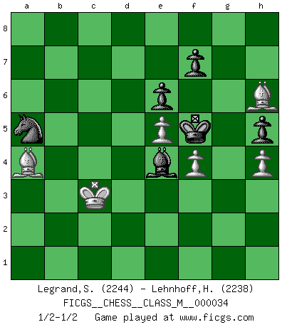 Last move : 1/2-1/2 2011 February 6 23:13:55 [Event "FICGS__CHESS__CLASS_M__000034"] [Site "FICGS"] [Date "2010.02.27"] [Round "1"] [White "Legrand,Stephane"] [Black "Lehnhoff,Heinz-Georg"] [Result "1/2-1/2"] [WhiteElo "2244"] [BlackElo "2238"] 1.d4 Nf6 2.c4 e6 3.Nc3 Bb4 4.g3 c5 5.Nf3 cxd4 6.Nxd4 O-O 7.Bg2 d5 8.cxd5 Nxd5 9.Qb3 Qa5 10.Bd2 Nc6 11.Nxc6 bxc6 12.O-O Bxc3 13.bxc3 Ba6 14.Rfd1 Qc5 15.e4 Bc4 16.Qa4 Nb6 17.Qb4 Qxb4 18.cxb4 Rfd8 19.Be3 Bb5 20.Rxd8+ Rxd8 21.Rc1 Nc4 22.Bxa7 Ra8 23.Rd1 h6 24.Rd7 c5 25.e5 Bxd7 26.Bxa8 cxb4 27.f4 Ba4 28.Kf2 Bc2 29.Bc5 Bb1 30.Bxb4 Nb6 31.Bc6 Bxa2 32.Bc5 Bd5 33.Be8 Nc4 34.Ke2 g5 35.Kd3 gxf4 36.gxf4 Kg7 37.Bb5 Na5 38.Ba4 Kg6 39.Bf8 h5 40.h4 Kf5 41.Bh6 Be4+ 42.Kc3 1/2-1/2 Nimzo-Indian : Romanishin-Kasparov (Steiner) system Kingside Castling by player Black (move 6) Kingside Castling by player White (move 12) This chess game ended in a draw. Follow this game move after move (download)A Chess game is divided into three stages: the first, when you hope you have the advantage, the second when you believe you have an advantage, and the third... when you know you're going to lose ! (Savielly Tartakower) Verschiedene, sehr schätzbare und im Laufe des Lebens nützliche Eigenschaften des Geistes können durch das Schachspiel erworben und gekräftigt werden, so dass sie zu Gewohnheiten werden, die uns nie im Stich lassen. (Benjamin Franklin) Vive, pierde y aprende al observar a tu oponente como ganar. (Amber Steenbock) J'apprécie les joueurs d'est-indienne, c'est grâce à eux que je nourris ma famille depuis tant d'années. (Petrosian) No man has ever achieved immortality in his own life time. (Unknown)