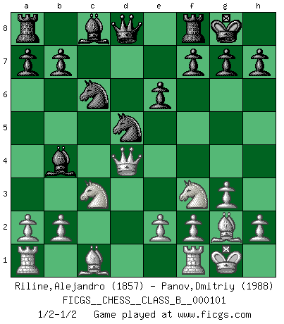 Last move : 1/2-1/2 2010 March 19 14:39:40 [Event "FICGS__CHESS__CLASS_B__000101"] [Site "FICGS"] [Date "2010.03.01"] [Round "1"] [White "Riline,Alejandro"] [Black "Panov,Dmitriy"] [Result "1/2-1/2"] [WhiteElo "1857"] [BlackElo "1988"] 1.d4 Nf6 2.c4 e6 3.Nc3 Bb4 4.Nf3 O-O 5.g3 c5 6.Bg2 d5 7.cxd5 cxd4 8.Qxd4 Nxd5 9.O-O Nc6 10.Qc4 Na5 11.Qd4 Nc6 12.Qc4 Na5 13.Qd4 Nc6 1/2-1/2 Nimzo-Indian : Three knights variation Kingside Castling by player Black (move 4) Kingside Castling by player White (move 9) This chess game ended in a draw. Follow this game move after move (download)With or without the title, Bobby Fischer was unquestionably the greatest player of his time. (Burt Hochberg) Man braucht nicht immer den besten Zug zu spielen: Ein Zug muß aktiv, unternehmungslustig, korrekt und schön sein. (David Bronstein) Fischer no está bajo la obligación de nadie. (Joseph Platz) Les échecs, c'est la lutte contre l'erreur. (Johannes Zukertort) Wisdom doesn't necessarily come with age. Sometimes age just shows up all by itself. (Tom Watson)