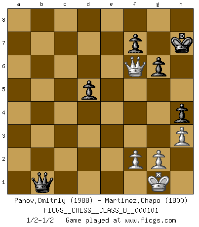 Last move : 1/2-1/2 2010 April 20 22:24:39 [Event "FICGS__CHESS__CLASS_B__000101"] [Site "FICGS"] [Date "2010.03.01"] [Round "1"] [White "Panov,Dmitriy"] [Black "Martinez,Chapo"] [Result "1/2-1/2"] [WhiteElo "1988"] [BlackElo "1800"] 1.e4 c5 2.c3 d5 3.exd5 Qxd5 4.d4 Nf6 5.dxc5 Qxc5 6.Nf3 g6 7.Be3 Qc7 8.Bb5+ Nc6 9.Qa4 Bd7 10.O-O a6 11.Na3 Bg7 12.Bf4 Qc8 13.Be2 O-O 14.Qb3 Be6 15.Qc2 b5 16.Qc1 Rd8 17.Nc2 Qb7 18.h3 b4 19.Ng5 Bf5 20.Bc4 e6 21.Ne3 bxc3 22.bxc3 Bd3 23.Bxd3 Rxd3 24.Qc2 Rad8 25.Rad1 Rxd1 26.Rxd1 Rxd1+ 27.Nxd1 Na5 28.Ne3 h6 29.Nf3 Qe4 30.Qd1 Nc6 31.Bc7 Nd5 32.Nxd5 exd5 33.Qf1 Qc2 34.Qe1 Qe4 35.Qf1 Bxc3 36.Qxa6 Nd4 37.Nxd4 Bxd4 38.Bg3 h5 39.Qc8+ Kg7 40.Qc1 h4 41.Bf4 Qe2 42.Be3 Bxe3 43.Qxe3 Qxa2 44.Qe5+ Kh7 45.Qf6 Qb1+ 46.Kh2 Qb8+ 47.Kg1 Qb1+ 1/2-1/2 Sicilian : Alapin's variation (2.c3) Kingside Castling by player White (move 10) Kingside Castling by player Black (move 13) This chess game ended in a draw. Follow this game move after move (download)Chess is a forcing house where the fruits of character can ripen more fully than in life. (Edward Morgan Foster) Deine Wertungszahl - vorausgesetzt einige Jahre schachliche Anstrengung - entspricht etwa dem zehnfachen Deines IQ plus 1000. (Jonathan Levitt) Por tratar de evitar la pérdida de una pieza, muchas personas han perdido una partida de Ajedrez. (Savielly Tartakover) Il n'y a pas de prix trop élevé au scalp de l'ennemi. (Koblentz) You know what they say : You lie down with the Devil, you wake up in Hell. (Horatio Caine, C.S.I. Miami)
