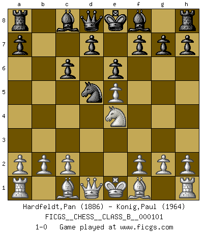 Last move : 1-0 2010 March 22 5:48:58 [Event "FICGS__CHESS__CLASS_B__000101"] [Site "FICGS"] [Date "2010.03.01"] [Round "1"] [White "Hardfeldt,Pan"] [Black "Konig,Paul"] [Result "1-0"] [WhiteElo "1886"] [BlackElo "1964"] 1.e4 c5 2.Nf3 Nc6 3.d4 cxd4 4.Nxd4 Nf6 5.Nc3 e6 6.Nxc6 bxc6 7.e5 Nd5 8.Ne4 1-0 Sicilian defense Player White won this chess game. Follow this game move after move (download)Chess is the art which expresses the science of logic. (Mikhail Botvinnik) Ich spiele ehrlich und spiele, um zu gewinnen. Wenn ich verliere nehme ich meine Medizin. (Robert James Fischer) Con o sin el título, Bobby Fischer fue sin lugar a dudas el mas grande jugador de su época. (Burt Hochberg) A chaque perte on perd un peu de soi. (Joël Lautier) In God we trust, all others we virus scan. (Anonymous)