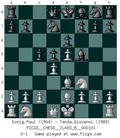 Last move : 0-1 2010 March 23 20:17:59 [Event "FICGS__CHESS__CLASS_B__000101"] [Site "FICGS"] [Date "2010.03.01"] [Round "1"] [White "Konig,Paul"] [Black "Tanda,Giovanni"] [Result "0-1"] [WhiteElo "1964"] [BlackElo "1983"] 1.e4 c6 2.d4 d5 3.e5 Bf5 4.Nf3 e6 5.Be2 Nd7 6.Be3 c5 0-1 Caro-Kann : Advance variation Player Black won this chess game. Follow this game move after move (download)Help your pieces so they can help you. (Paul Morphy) Viele Opfer benötigen überhaupt keine konkrete Berechnung. Es genügt sich die entstehende Position kurz vorzustellen, um uns davon zu überzeugen, dass das Opfer korrekt ist. (Mikhail Nekhemyevich Tal) El Ajedrez es un juego de pelea el cual es puramente intelectual e incluye la suerte. (Richard Reti) C'est une question de caractère, Beaucoup de gens perdent leur motivation très vite. D'autres, ils sont rares, peuvent la conserver très longtemps. J'aime les échecs, encore aujourd'hui je suis heureux d'analyser des parties. J'aime toujours gagner, je déteste encore perdre. Bien jouer est important pour mon intégrité intellectuelle et morale. Et puis les échecs vivent en ce moment une période historique grâce à Internet. Ils se développent dans les systèmes éducatifs à travers le monde. Ils sortent de leur ghetto, et c'est mon rôle de mener à bien cette révolution. (Gary Kasparov) It is the aim of the modern school, not to treat every position according to one general law, but according to the principle inherent in the position. (Richard Reti)