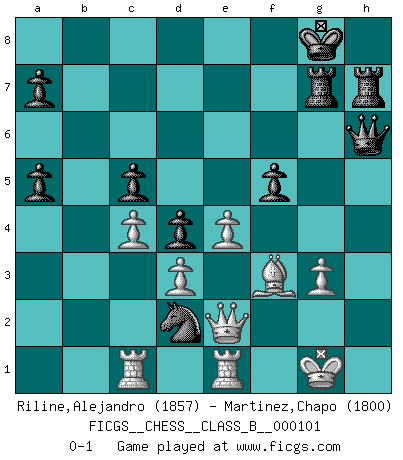 Last move : 0-1 2010 March 24 3:39:17 [Event "FICGS__CHESS__CLASS_B__000101"] [Site "FICGS"] [Date "2010.03.01"] [Round "1"] [White "Riline,Alejandro"] [Black "Martinez,Chapo"] [Result "0-1"] [WhiteElo "1857"] [BlackElo "1800"] 1.c4 Nf6 2.Nf3 e6 3.g3 d5 4.b3 Be7 5.Bb2 O-O 6.Bg2 c5 7.O-O Nc6 8.cxd5 Nxd5 9.Nc3 Bf6 10.a3 b6 11.Qc2 Ba6 12.d3 Rc8 13.Nxd5 exd5 14.Rfd1 Re8 15.Rac1 Qd6 16.Bh3 Rc7 17.e3 R8e7 18.Bg2 h6 19.Qb1 d4 20.e4 Bg5 21.Rc2 Bb5 22.Bc1 Bxc1 23.R2xc1 Qd7 24.h4 Qe6 25.Nd2 Ne5 26.Nc4 Bxc4 27.bxc4 g5 28.hxg5 hxg5 29.a4 g4 30.a5 Nf3+ 31.Kf1 f5 32.Qa2 bxa5 33.Re1 Qh6 34.Qe2 Nd2+ 35.Kg1 Rh7 36.f4 gxf3 37.Bxf3 Rcg7 0-1 English Opening Kingside Castling by player Black (move 5) Kingside Castling by player White (move 7) Player Black won this chess game. Follow this game move after move (download)The beauty of a move lies not in its' appearance but in the thought behind it. (Siegbert Tarrasch) Um dein Spiel zu verbessern musst du zuallererst das Endspiel studieren, denn diese kann unabhängig studiert werden. Die Eröffnung und das Mittelspiel müssen immer in Bezug gesetzt werden zum Endspiel. (José Raúl Capablanca) Ciertamente el estado mental actual de Bobby Fischer es una tragedia. Uno de los mas grandes jugadores de Ajedrez del mundo -el orgullo y pena del Ajedrez Americano. (Frank Brady) La tactique est l'élément le plus important du milieu de jeu. (Siegbert Tarrasch) Ah, beer! The cause of, and the solution to, all of life's problems. (Homer Simpson)
