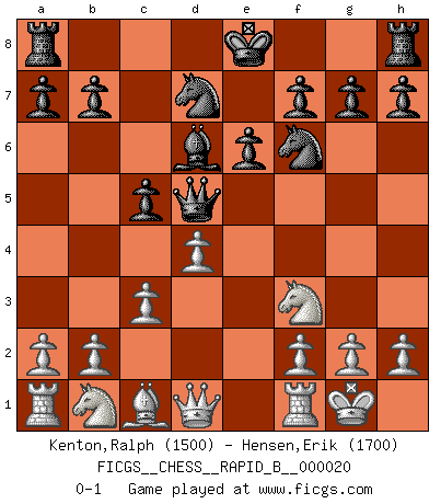 Last move : 0-1 2006 November 26 3:27:56 [Event "FICGS__CHESS__RAPID_B__000020"] [Site "FICGS"] [Date "2006.10.17"] [Round "1"] [White "Kenton,Ralph"] [Black "Hensen,Erik"] [Result "0-1"] [WhiteElo "1500"] [BlackElo "1700"] 1.e4 c5 2.c3 d5 3.exd5 Qxd5 4.d4 Nf6 5.Nf3 e6 6.Bb5+ Bd7 7.Bxd7+ Nbxd7 8.O-O Bd6 0-1 This chess game has been lost on time (started : 2006.10.17 19:12:14) Sicilian : Alapin's variation (2.c3) Kingside Castling by player White (move 8) Player Black won this chess game. Follow this game move after move (download)Only the player with the initiative has the right to attack. (Wilhelm Steinitz) Das Schachspiel übertrifft alle anderen Spiele so weit wie der Chimborasso einen Misthaufen. (Arthur Schopenhauer) En el Ajedrez, tal como es jugado por los Maestros, practicamente la suerte es eliminada. (Emanuel Lasker) Celui qui prend des risques peut perdre, celui qui n'en prend pas perd toujours. (Xavier Tartacover) It's not a bug - it's an undocumented feature. (Anonymous)