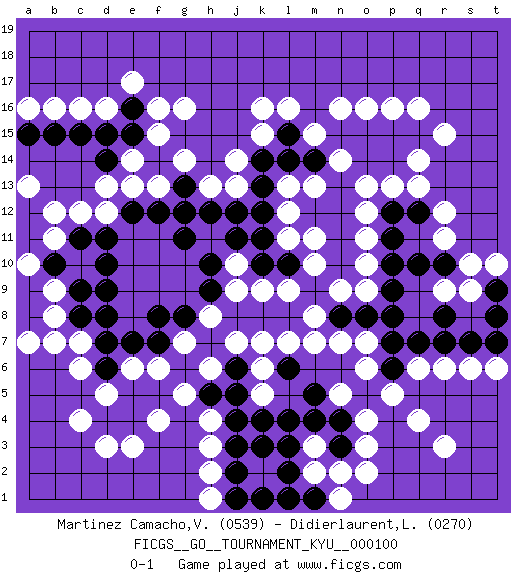 Last move : 0-1 2010 July 26 20:22:30 [Event "FICGS__GO__TOURNAMENT_KYU__000100"] [Site "FICGS"] [Date "2010.03.01"] [Round "1"] [Black "Martinez Camacho,Victor Hugo"] [White "Didierlaurent,Ludovic"] [Result "0-1"] [Rating 1 "0539"] [Rating 2 "0270"] 1.d4 q16 2.m4 q4 3.o5 o4 4.n4 p5 5.l4 c16 6.d10 o3 7.p6 q6 8.p8 o6 9.p7 n5 10.p11 e17 11.d14 m7 12.n8 n7 13.m9 o16 14.e16 d16 15.d15 f16 16.e15 f15 17.f14 g14 18.g13 h13 19.g12 j14 20.k10 h4 21.h12 f4 22.j4 d3 23.e4 e3 24.f5 g5 25.h5 f6 26.e5 e6 27.d6 c4 28.d8 d5 29.e7 h6 30.j5 c6 31.d7 k7 32.k4 h3 33.j6 j7 34.j3 m2 35.n3 n2 36.j2 h2 37.j1 h1 38.l8 l7 39.k12 k16 40.k14 k15 41.m14 m15 42.l14 q13 43.p14 q14 44.p15 p16 45.q15 r15 46.n15 n16 47.o15 p13 48.k13 n14 49.o14 o13 50.c15 b16 51.b15 r3 52.q7 r6 53.r7 r11 54.n13 o12 55.n12 o11 56.p10 o10 57.p9 m8 58.o8 n9 59.n10 o9 60.n11 l9 61.l10 m10 62.k8 k9 63.j8 j9 64.h9 h8 65.h10 j10 66.j11 m11 67.k11 m13 68.l15 l16 69.m12 l12 70.p12 c7 71.c8 b8 72.c9 b9 73.g8 r9 74.a15 a16 75.q12 r12 76.r10 s10 77.q10 g16 78.f7 b11 79.c11 c12 80.d11 d12 81.d9 e13 82.e12 d13 83.f12 f13 84.b10 e14 85.a11 b12 86.a12 a13 87.a9 b7 88.a8 a7 89.l2 m3 90.l3 o2 91.l1 k2 92.k1 j13 93.j12 g7 94.f8 l13 95.k3 l11 96.g11 a10 97.s7 s6 98.t7 t6 99.r8 s9 100.m5 k6 101.l6 k5 102.m1 n1 103.t9 t10 104.t8 o7 0-1 Here are the names of the openings (joseki) played in the four corners : Corner q4 : m4 q4 This joseki is unknown. A weak or weird move has probably been played in this corner. Corner q16 : q16 p11 Hoshi (Hwajeom, Seongjeom, Xingwei`) 4-4 Point. The star or hoshi (4-4) point, emphasizing influence at the potential expense of territory. Corner d4 : d4 h4 Hoshi (Hwajeom, Seongjeom, Xingwei`) 4-4 Point. The star or hoshi (4-4) point, emphasizing influence at the potential expense of territory. Player White won this Go (weiqi, baduk) game. Follow this game move after move (download)Error is one of the sources of transformation. (Pierre Audouard) Man with more than one clock never knows what time it is. (Chinese thought)