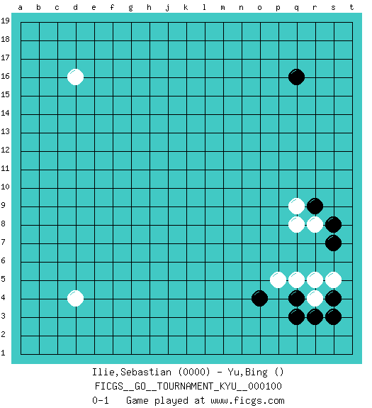 Last move : 0-1 2010 April 14 8:55:33 [Event "FICGS__GO__TOURNAMENT_KYU__000100"] [Site "FICGS"] [Date "2010.03.01"] [Round "1"] [Black "Ilie,Sebastian"] [White "Yu,Bing"] [Result "0-1"] [Rating 1 "0000"] 1.q16 d4 2.q3 d16 3.r9 q5 4.q4 p5 5.o4 r5 6.s4 r4 7.r3 s5 8.s3 r8 9.s8 q8 10.s7 q9 0-1 This go game has been lost on time (started : 2010.03.01 16:22:1) Here are the names of the openings (joseki) played in the four corners : Player White won this Go (weiqi, baduk) game. Follow this game move after move (download)Territory is a closed space where time no longer exists. The transformation around it slower alter it, and sometimes it cracks open like a rotten egg at the least shock. (Pierre Audouard) When you stop learning you start dying. (Scott Adams)