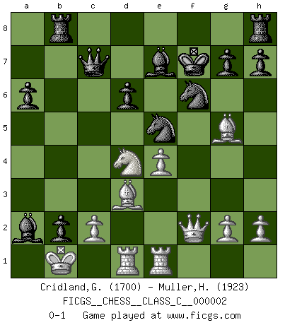 Last move : 0-1 2006 June 21 22:13:7 [Event "FICGS__CHESS__CLASS_C__000002"] [Site "FICGS"] [Date "2006.04.26"] [Round "1"] [White "Cridland,Graham"] [Black "Muller,Henri-Louis"] [Result "0-1"] [WhiteElo "1700"] [BlackElo "1923"] 1.e4 c5 2.Nf3 d6 3.d4 cxd4 4.Nxd4 Nf6 5.Nc3 a6 6.Bg5 e6 7.f4 Qb6 8.Nb3 Nbd7 9.Qf3 Be7 10.O-O-O Qc7 11.Bd3 b5 12.Rhe1 Bb7 13.f5 b4 14.fxe6 Ne5 15.exf7+ Kxf7 16.Qf5 bxc3 17.Nd4 cxb2+ 18.Kb1 Bc8 19.Qf2 Rb8 20.Nf3 Be6 21.Nd4 Bxa2+ 0-1 Sicilian : Najdorf, 7...Qb6 Queenside Castling by player White (move 10) Player Black won this chess game. Follow this game move after move (download)That's what Chess is all about. One day you give your opponent a lesson, the next day he gives you one. (Bobby Fischer) Schach ist ein schwarz-weisser Dschungel. (Garry Kasparov) Solo el jugador con la iniciativa tiene el derecho a atacar. (Wilhelm Steinitz) Les ravages du H expliquent la différence de niveau entre Tal et Thal [Abergel]. The Internet is the first thing that humanity has build that humanity doesn't understand, the largest experiment in anarchy that we have ever had. (Eric Schmidt)