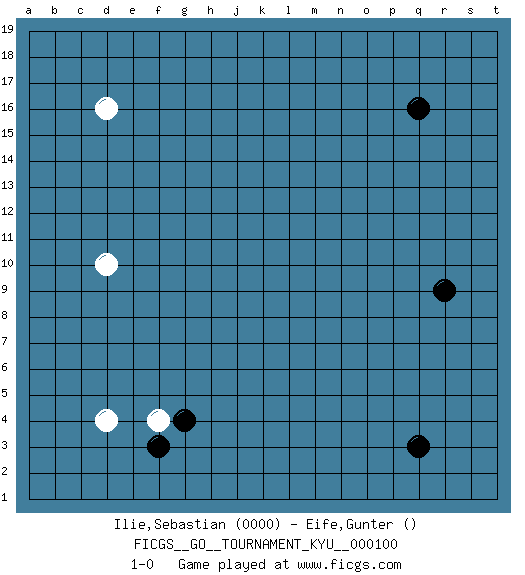 Last move : 1-0 2010 March 29 20:55:25 [Event "FICGS__GO__TOURNAMENT_KYU__000100"] [Site "FICGS"] [Date "2010.03.01"] [Round "1"] [Black "Ilie,Sebastian"] [White "Eife,Gunter"] [Result "1-0"] [Rating 1 "0000"] 1.q16 d16 2.q3 d4 3.r9 d10 4.f3 f4 5.g4 1-0 Here are the names of the openings (joseki) played in the four corners : Corner d4 : d4 f3 Hoshi (Hwajeom, Seongjeom, Xingwei`) 4-4 Point. The star or hoshi (4-4) point, emphasizing influence at the potential expense of territory. Ikken Kakari (Hankan Keolch'im, Yi Gua`jiao~, 1-Space Low Approach). Black 2 is the standard approach move to the 4-4. Player Black won this Go (weiqi, baduk) game. Follow this game move after move (download)Only amateurs try to come up with fancy moves. (Anonymous) It's only after you lost everything, Tyler says, that you're free to do anything. (Chuck Palahniuk, Fight Club)