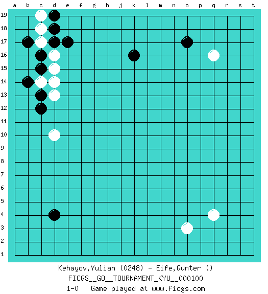 Last move : 1-0 2010 March 29 20:55:5 [Event "FICGS__GO__TOURNAMENT_KYU__000100"] [Site "FICGS"] [Date "2010.03.01"] [Round "1"] [Black "Kehayov,Yulian"] [White "Eife,Gunter"] [Result "1-0"] [Rating 1 "0248"] 1.c16 d15 2.e17 q4 3.d4 q16 4.o17 o3 5.k16 d10 6.c15 d14 7.c13 d13 8.c12 c14 9.b14 d16 10.d17 c17 11.b17 c18 12.d18 c19 13.d19 1-0 Here are the names of the openings (joseki) played in the four corners : Corner d16 : c16 d15 Komoku (Somok, Xiao~mu`) 3-4 Point. The komoku (3-4) point is the traditional corner enclosure move.. Corner q16 : q16 o17 Hoshi (Hwajeom, Seongjeom, Xingwei`) 4-4 Point. The star or hoshi (4-4) point, emphasizing influence at the potential expense of territory. Ikken Kakari (Hankan Keolch'im, Yi Gua`jiao~, 1-Space Low Approach). Black 2 is the standard approach move to the 4-4. Corner d4 : d4 1-0 Hoshi (Hwajeom, Seongjeom, Xingwei`) 4-4 Point. The star or hoshi (4-4) point, emphasizing influence at the potential expense of territory. Player Black won this Go (weiqi, baduk) game. Follow this game move after move (download)Eyes win semiais. (Anonymous) The intuitive mind is a sacred gift; the rational mind is a faithful servant. We have created a society that honors the servant but has forgotten the gift. (Albert Einstein)