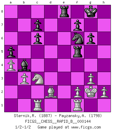 Last move : 1/2-1/2 2010 March 6 10:51:25 [Event "FICGS__CHESS__RAPID_B__000144"] [Site "FICGS"] [Date "2010.03.01"] [Round "1"] [White "Sternik,Ryszard"] [Black "Payzansky,Aleksey"] [Result "1/2-1/2"] [WhiteElo "1887"] [BlackElo "1798"] 1.Nf3 Nf6 2.c4 g6 3.Nc3 d5 4.d4 Bg7 5.Bf4 O-O 6.Rc1 dxc4 7.e3 Be6 8.Ng5 Bd5 9.e4 h6 10.exd5 hxg5 11.Bxg5 Nxd5 12.Bxc4 Nb6 13.Bb3 Nc6 14.Ne2 a5 15.a4 Qd6 16.O-O Rfd8 17.Bf4 e5 18.dxe5 Bxe5 19.Qxd6 Bxd6 20.Bg5 Re8 21.Be3 Re4 22.Bc2 Rb4 23.b3 Nd5 24.Bd2 Rh4 25.g3 Rh5 26.Be4 Re8 27.Bf3 Rf5 28.Kg2 Bb4 29.Nc3 Nf6 30.Bxc6 bxc6 1/2-1/2 Reti Opening Kingside Castling by player Black (move 5) Kingside Castling by player White (move 16) This chess game ended in a draw. Follow this game move after move (download)Via the squares on the chessboard, the Indians explain the movement of time and the age, the higher influences which control the world and the ties which link Chess with the human soul. (Al-Masudi) Karpov ist ein Museumsstück. (Garry Kasparov) Solo el jugador con la iniciativa tiene el derecho a atacar. (Wilhelm Steinitz) Le génie consiste à savoir transgresser les règles au moment opportun. (Teichmann) They say poker is a zero-sum game. It must be, because every time I play my sum ends up zero. (Max Shapiro)