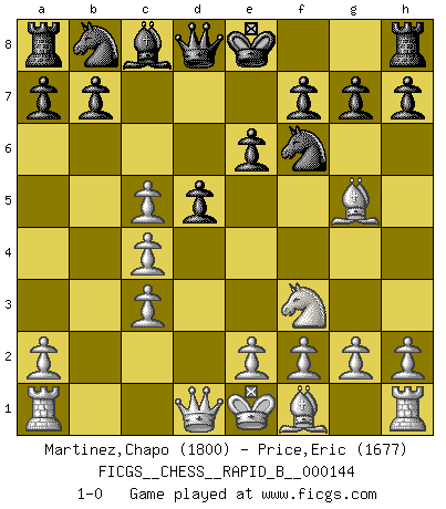 Last move : 1-0 2010 April 8 16:54:55 [Event "FICGS__CHESS__RAPID_B__000144"] [Site "FICGS"] [Date "2010.03.01"] [Round "1"] [White "Martinez,Chapo"] [Black "Price,Eric"] [Result "1-0"] [WhiteElo "1800"] [BlackElo "1677"] 1.d4 d5 2.c4 e6 3.Nc3 Nf6 4.Nf3 Bb4 5.Bg5 Bxc3+ 6.bxc3 c5 7.dxc5 1-0 QGD : Ragozin variation Player White won this chess game. Follow this game move after move (download)There are two types of sacrifices: correct ones and mine. (Mikhail Tal) Wie gewinnt Tal? Er entwickelt alle seine Figuren in die Brettmitte und opfert sie dann irgendwo. (Robert James Fischer) Siempre es mejor sacrificar los hombres de tu oponente. (Savielly Tartakower) On croit qu'il y a plus de mauvais joueurs que de bons joueurs, c'est faux : Il y a autant de joueurs qui gagnent que de joueurs qui perdent. (Philippe Geluck) There is no instance of a country having benefited from prolonged warfare. (Sun Tzu)