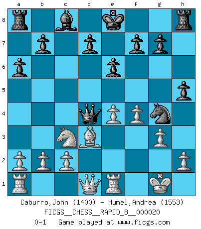 Last move : 0-1 2006 November 15 11:1:8 [Event "FICGS__CHESS__RAPID_B__000020"] [Site "FICGS"] [Date "2006.10.17"] [Round "1"] [White "Caburro,John"] [Black "Humel,Andrea"] [Result "0-1"] [WhiteElo "1400"] [BlackElo "1553"] 1.e4 c5 2.Nf3 e6 3.d4 cxd4 4.Nxd4 a6 5.Bd3 Qc7 6.O-O Nf6 7.Nc3 h5 8.Nf3 Nc6 9.Re1 Bc5 10.Be3 Bxe3 11.Rxe3 Ng4 12.Re1 Nce5 13.Nxe5 Qxe5 14.g3 Qf6 15.f4 Qd4+ 0-1 Sicilian : Kan, 5.Bd3 Kingside Castling by player White (move 6) Player Black won this chess game. Follow this game move after move (download)Methodical thinking is of more use in Chess than inspiration. (C. J. S. Purdy) Die westlichen Werte sind eine Sprache, welche die Putin-Administration nicht versteht. (Garry Kasparov) Yo jugué Ajedrez con el y a veces le pude haber ganado solo que siempre devuelve su última jugada y juega la partida de manera diferente. (Mark Twain) Vouloir jouer aux échecs contre soi-même est aussi paradoxal que vouloir marcher sur son ombre. (Stefan Zweig) If passion drives you, let reason holds the reins. (Benjamin Franklin)