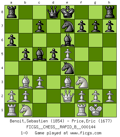 Last move : 1-0 2010 April 11 20:57:36 [Event "FICGS__CHESS__RAPID_B__000144"] [Site "FICGS"] [Date "2010.03.01"] [Round "1"] [White "Benoit,Sebastien"] [Black "Price,Eric"] [Result "1-0"] [WhiteElo "1854"] [BlackElo "1677"] 1.e4 e5 2.Nf3 Nc6 3.Bb5 a6 4.Ba4 Nf6 5.O-O Nxe4 6.d4 b5 7.Bb3 d5 8.dxe5 Be6 9.Qe2 Bc5 10.Be3 Ne7 11.c3 1-0 This chess game has been lost on time (started : 2010.03.01 16:59:11) Ruy Lopez : Open, 7.Bb3 Kingside Castling by player White (move 5) Player White won this chess game. Follow this game move after move (download)The chessboard is the world, the pieces are the phenomena of the Universe, the rules of the game are what we call the laws of Nature and the player on the other side is hidden from us. (Thomas Huxley) Modernes Schach sorgt sich zuviel um Dinge wie Bauernstruktur usw. Vergessen Sie das, Schachmatt beendet das Spiel! (Nigel Short) El Ajedrez es el arte del análisis. (Mikhail Botvinnik) A ce moment-là, je menaçais de comprendre la position ! (Clément L'Heureux) Knowledge will give you power, but character respect. (Bruce Lee)