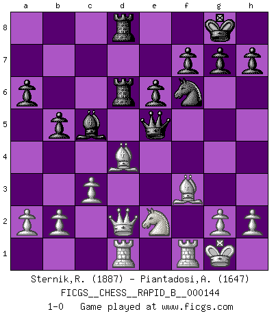 Last move : 1-0 2010 March 20 19:13:13 [Event "FICGS__CHESS__RAPID_B__000144"] [Site "FICGS"] [Date "2010.03.01"] [Round "1"] [White "Sternik,Ryszard"] [Black "Piantadosi,Angelo"] [Result "1-0"] [WhiteElo "1887"] [BlackElo "1647"] 1.e4 c5 2.Nf3 d6 3.d4 cxd4 4.Nxd4 Nf6 5.Nc3 a6 6.Be3 e6 7.Be2 Nc6 8.Qd2 Be7 9.Rd1 O-O 10.O-O Qc7 11.f4 b5 12.Bf3 Bb7 13.e5 dxe5 14.Nxc6 Bxc6 15.fxe5 Qxe5 16.Bd4 Bc5 17.Bxc6 Rad8 18.Ne2 Rd6 19.Bf3 Rfd8 20.c3 1-0 Sicilian : Najdorf, Byrne (English) attack Kingside Castling by player Black (move 9) Kingside Castling by player White (move 10) Player White won this chess game. Follow this game move after move (download)Chess is played with the mind and not with the hands ! (Renaud and Kahn) Du kannst im Schach nur gut werden, wenn du das Spiel liebst. (Robert James Fischer) Evita las multitudes. Haz independientemente tu propio razonamiento. Trata de ser el jugador de Ajedrez, no la pieza de Ajedrez. (Ralph Charell) Le plus grand jeu de l'esprit jamais inventé, plus vous l'apprenez, plus vous y prenez du plaisir. (Garry Kasparov) If you ain't just a little scared when you enter a casino, you are either very rich or you haven't studied the games enough. (Pappy)