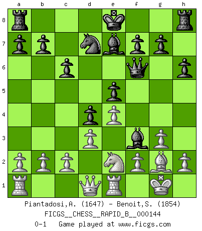 Last move : 0-1 2010 March 12 20:46:9 [Event "FICGS__CHESS__RAPID_B__000144"] [Site "FICGS"] [Date "2010.03.01"] [Round "1"] [White "Piantadosi,Angelo"] [Black "Benoit,Sebastien"] [Result "0-1"] [WhiteElo "1647"] [BlackElo "1854"] 1.Nf3 Nf6 2.g3 d5 3.Bg2 c6 4.O-O Bg4 5.d3 Nbd7 6.Re1 e5 7.Bg5 h6 8.Bxf6 Qxf6 9.Nc3 Be7 10.e4 d4 11.Ne2 Bxf3 0-1 Reti Opening Kingside Castling by player White (move 4) Player Black won this chess game. Follow this game move after move (download)First-class players lose to second class players because second-class players sometimes play a first-class game. (Tarrasch) Wenn man heute mit 14 Jahren noch kein GM ist, kann man es vergessen. (Viswanathan Anand) No es tiempo de jugar al Ajedrez cuando la casa esta en llamas. (Proverbio Italiano) Nous vivons dans un monde échiquéen : chaque jour qui passe est un défi à relever. (Philosophe Sasha) Art disturbs, science reassures. (Georges Braque, Le Jour et la Nuit)
