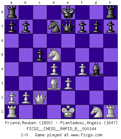 Last move : 1-0 2010 May 2 22:15:2 [Event "FICGS__CHESS__RAPID_B__000144"] [Site "FICGS"] [Date "2010.03.01"] [Round "1"] [White "Friend,Reuben"] [Black "Piantadosi,Angelo"] [Result "1-0"] [WhiteElo "1800"] [BlackElo "1647"] 1.d4 d5 2.c4 e6 3.Nc3 Nf6 4.cxd5 exd5 5.Bg5 c6 6.e3 Be7 7.Bd3 Bg4 8.Qc2 Nbd7 9.h3 Bh5 10.f4 c5 11.g4 Nxg4 12.hxg4 Bxg4 13.Bxe7 Qxe7 14.Nxd5 1-0 QGD : Exchange, positional line, 5...c6 Player White won this chess game. Follow this game move after move (download)The combination player thinks forward; he starts from the given position, and tries the forceful moves in his mind. (Emanuel Lasker) Verschiedene, sehr schätzbare und im Laufe des Lebens nützliche Eigenschaften des Geistes können durch das Schachspiel erworben und gekräftigt werden, so dass sie zu Gewohnheiten werden, die uns nie im Stich lassen. (Benjamin Franklin) En posiciones complicadas, Bobby Fischer pocas veces tuvo que temer de cualquiera. (Paul Keres) Les échecs sont utiles à l'exercice de la faculté de penser et à celle de l'imagination. Car nous devons posséder une méthode élaborée pour atteindre des buts partout où nous devons conduire notre raison. (Leibnitz) The project of the man are lower than those of the sky. (Chinese proverb)
