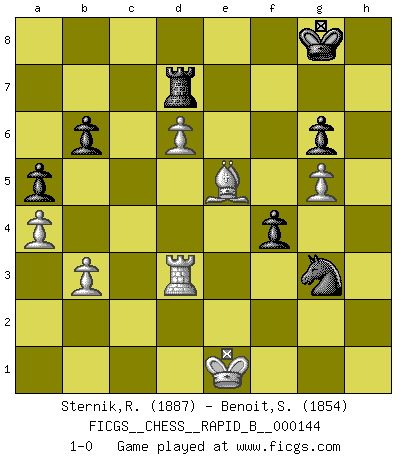 Last move : 1-0 2010 March 16 14:14:35 [Event "FICGS__CHESS__RAPID_B__000144"] [Site "FICGS"] [Date "2010.03.01"] [Round "1"] [White "Sternik,Ryszard"] [Black "Benoit,Sebastien"] [Result "1-0"] [WhiteElo "1887"] [BlackElo "1854"] 1.e4 c5 2.Nc3 Nc6 3.g3 g6 4.Bg2 Bg7 5.d3 e6 6.Be3 d6 7.f4 Nge7 8.Nf3 O-O 9.O-O Nd4 10.e5 Nef5 11.Bf2 Bd7 12.Ne4 Nxf3+ 13.Bxf3 dxe5 14.fxe5 Bxe5 15.Nxc5 Bc6 16.c3 Qc7 17.Qe2 Bg7 18.Rae1 Bxf3 19.Qxf3 h5 20.d4 b6 21.Ne4 Rad8 22.h3 Nd6 23.Nf6+ Bxf6 24.Qxf6 Rd7 25.g4 hxg4 26.Bg3 Ne4 27.Bxc7 Nxf6 28.Be5 Nh7 29.hxg4 f6 30.Bg3 Kf7 31.Kg2 f5 32.Be5 Nf6 33.g5 Nh5 34.a4 Rc8 35.Re3 Rc4 36.b3 Rc8 37.Kf3 a5 38.Rfe1 Rd5 39.R1e2 Rd7 40.Rd2 Re8 41.Red3 Rde7 42.Rb2 Rc8 43.c4 Rc6 44.Re2 Rc8 45.d5 exd5 46.cxd5 Rc1 47.d6 Rd7 48.Kf2 Kg8 49.Rde3 f4 50.Rd3 Ng3 51.Re1 Rxe1 52.Kxe1 1-0 Sicilian : Closed Kingside Castling by player Black (move 8) Kingside Castling by player White (move 9) Player White won this chess game. Follow this game move after move (download)Chess is not like life... it has rules ! (Mark Pasternak) Um sich vor der Gefahr einer Erkältung zu schützen, sorge der wanderlustige König beizeiten für ein brauchbares Versteck. (Aaron Nimzowitsch) El hombre es un frívolo, una creatura engañosa y como un jugador de Ajedrez, se preocupa mas por el proceso de obtener su meta que de la meta por sí misma. (Dostoyevsky) La solitude du joueur d'Echecs à l'approche du mat est semblable à celle du condamné. (Francis Szpiner) Now the reason the enlightened prince and the wise general conquer the enemy whenever they move and their achievements surpass those of ordinary men is foreknowledge. (Sun Tzu)