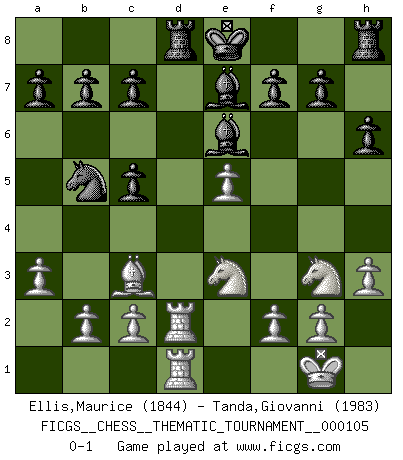 Last move : 0-1 2010 June 20 20:55:32 [Event "FICGS__CHESS__THEMATIC_TOURNAMENT__000105"] [Site "FICGS"] [Date "2010.03.01"] [Round "1"] [White "Ellis,Maurice"] [Black "Tanda,Giovanni"] [Result "0-1"] [WhiteElo "1844"] [BlackElo "1983"] 1.e4 e5 2.Nf3 Nc6 3.Bb5 Nf6 4.O-O Nxe4 5.d4 Nd6 6.Bxc6 dxc6 7.dxe5 Nf5 8.Qxd8+ Kxd8 9.Nc3 Ke8 10.h3 Ne7 11.Ne4 Ng6 12.Re1 h6 13.a3 Be6 14.Nd4 Bd5 15.Bd2 c5 16.Nf5 Be6 17.Neg3 Ne7 18.Ne3 Nc6 19.Bc3 Nd4 20.Rad1 Rd8 21.Rd2 Nb5 22.Red1 Be7 0-1 Ruy Lopez : Berlin defense, Open variation Kingside Castling by player White (move 4) Player Black won this chess game. Follow this game move after move (download)We like to think. (Gary Kasparov) Wer wird heute Abend ihr Gegner sein? -- Heute Abend spiele ich gegen die schwarzen Steine. (Akiba Rubinstein) El jugador táctico sabe que hacer cuando hay algo que hacer; mientras que el estratega sabe que hacer cuando no hay nada que hacer. (Gerald Abrahams) Il n'y a plus de joueurs du niveau de Jacob Murray dont la seule quête est le beau jeu, le plaisir de voir les pièces construire quelque chose. Sur 10 idées à la minute, 9 seront sans intérêt, la dernière s'avèrera géniale. (Christian Bauer) Luck is the residue of design. (John Milton)