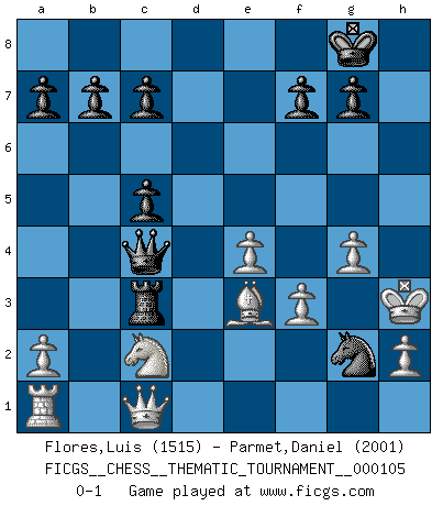 Last move : 0-1 2010 April 14 2:6:19 [Event "FICGS__CHESS__THEMATIC_TOURNAMENT__000105"] [Site "FICGS"] [Date "2010.03.01"] [Round "1"] [White "Flores,Luis"] [Black "Parmet,Daniel"] [Result "0-1"] [WhiteElo "1515"] [BlackElo "2001"] 1.e4 e5 2.Nf3 Nc6 3.Bb5 Nf6 4.Bxc6 dxc6 5.O-O Bd6 6.Re1 O-O 7.d4 Bg4 8.dxe5 Bxf3 9.Qxf3 Bxe5 10.Rd1 Qe7 11.Re1 Rad8 12.c3 Rfe8 13.g3 Nd7 14.Na3 Qe6 15.Qe2 Nc5 16.Nc2 Qg6 17.f3 h5 18.Ne3 h4 19.g4 Nd3 20.Rd1 Nf4 21.Qf1 Qe6 22.Nc2 Rxd1 23.Qxd1 h3 24.Be3 Qf6 25.Qf1 Ng2 26.Kh1 Bxc3 27.bxc3 Qxc3 28.Qc1 Rd8 29.Kg1 Qc4 30.Kf2 Rd3 31.Kg3 c5 32.Kxh3 Rc3 0-1 Ruy Lopez : Berlin defense Kingside Castling by player White (move 5) Kingside Castling by player Black (move 6) Player Black won this chess game. Follow this game move after move (download)I look one move ahead... the best ! (Siegbert Tarrasch) Im Leben werden Partien nie so unstrittig gewonnen wie im Spiel (Emanuel Lasker) No es tiempo de jugar al Ajedrez cuando la casa esta en llamas. (Proverbio Italiano) L'action d'une oeuvre littéraire se déroule sur un champ de bataille. Les masques et les types du drame moderne correspondent aux pièces du jeu d'échecs. L'intrigue correspond aux coups et aux gambits, c'est à dire aux techniques du jeu telles qu'utilisées et interprétées par les joueurs. Les tactiques et les péripéties [mouvements] correspondent aux coups exécutés par l'adversaire. (Viktor Shklovsky) Macintosh - we might not get everything right, but at least we knew the century was going to end. (Douglas Adams)