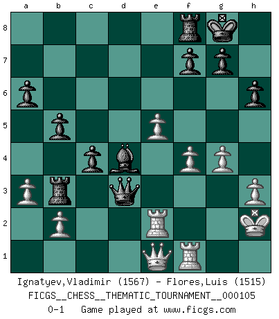 Last move : 0-1 2010 April 10 17:24:30 [Event "FICGS__CHESS__THEMATIC_TOURNAMENT__000105"] [Site "FICGS"] [Date "2010.03.01"] [Round "1"] [White "Ignatyev,Vladimir"] [Black "Flores,Luis"] [Result "0-1"] [WhiteElo "1567"] [BlackElo "1515"] 1.e4 e5 2.Nf3 Nc6 3.Bb5 Nf6 4.d3 d6 5.c3 Be7 6.O-O O-O 7.h3 Bd7 8.Qe2 a6 9.Ba4 b5 10.Bc2 h6 11.Be3 Be6 12.d4 Bc4 13.Bd3 exd4 14.cxd4 Bxd3 15.Qxd3 Nb4 16.Qb3 c5 17.a3 Nc6 18.e5 c4 19.Qc2 Nd5 20.Bd2 dxe5 21.dxe5 Qd7 22.Nc3 Rad8 23.Nxd5 Qxd5 24.Bf4 Nd4 25.Nxd4 Qxd4 26.Bg3 Qd2 27.Rac1 Bc5 28.Kh2 Rd3 29.Qb1 Bd4 30.Rc2 Qg5 31.Qe1 Qf5 32.f4 Rxg3 33.Re2 Rb3 34.g4 Qd3 0-1 Ruy Lopez : Berlin defense Kingside Castling by player White (move 6) Kingside Castling by player Black (move 6) Player Black won this chess game. Follow this game move after move (download)In complicated positions, Bobby Fischer hardly had to be afraid of anybody. (Paul Keres) Viele Opfer benötigen überhaupt keine konkrete Berechnung. Es genügt sich die entstehende Position kurz vorzustellen, um uns davon zu überzeugen, dass das Opfer korrekt ist. (Mikhail Nekhemyevich Tal) De eso se trata el Ajedrez. Un día le das una lección a tu oponente y al día siguiente el te da una a tí. (Bobby Fischer) Il n'y a pas eu de défaite parce que je ne crois pas que cet ordinateur ait jamais existé. IBM a triché en refusant d'imprimer les modes de recherche de la machine. C'est évident, pendant le match, des coups décisifs ont été joués par des êtres humains. Aujourd'hui, les meilleurs spécialistes en informatique ne peuvent toujours pas expliquer comment Deep-Blue a pu jouer contre la logique des ordinateurs. IBM a gagné une guerre de communication, mais ils sont incapables de prouver que l'ordinateur a gagné tout seul. (Garry Kasparov) Wisdom doesn't necessarily come with age. Sometimes age just shows up all by itself. (Tom Watson)