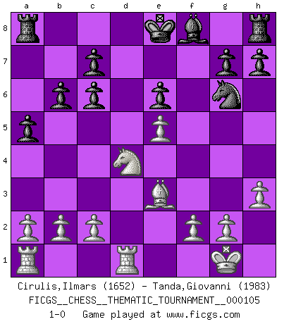 Last move : 1-0 2010 April 9 15:26:51 [Event "FICGS__CHESS__THEMATIC_TOURNAMENT__000105"] [Site "FICGS"] [Date "2010.03.01"] [Round "1"] [White "Cirulis,Ilmars"] [Black "Tanda,Giovanni"] [Result "1-0"] [WhiteElo "1652"] [BlackElo "1983"] 1.e4 e5 2.Nf3 Nc6 3.Bb5 Nf6 4.O-O Nxe4 5.d4 Nd6 6.Bxc6 dxc6 7.dxe5 Nf5 8.Qxd8+ Kxd8 9.Nc3 Ke8 10.Rd1 Ne7 11.h3 Ng6 12.Ne2 a5 13.Ned4 Be6 14.Nxe6 fxe6 15.Ng5 Ke7 16.Be3 b6 17.Nf3 Ke8 18.Nd4 1-0 Ruy Lopez : Berlin defense, Open variation Kingside Castling by player White (move 4) Player White won this chess game. Follow this game move after move (download)I love all positions. Give me a difficult positional game, I will play it. But totally won positions, I cannot stand them. (Hein Donner) Der Umstand, daß uns eine 7 Stunden Zeitkontrolle ermöglicht eine großartige, tiefe Partie zu spielen, ist für die Massenmedien nicht weiter von Bedeutung. (Alexej Shirov) La captura del Rey enemigo es la finalidad pero no el primer objetivo de la partida. (William Steinitz) Ce qui est bien, c'est d'avoir tout un tas de pièces en prise : l'adversaire ne peut en prendre qu'une à la fois. Cité par Thierry Audin. Humor is by far the most significant activity of the human brain. (Edward De Bono)