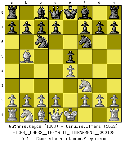 Last move : 0-1 2010 April 10 20:50:18 [Event "FICGS__CHESS__THEMATIC_TOURNAMENT__000105"] [Site "FICGS"] [Date "2010.03.01"] [Round "1"] [White "Guthrie,Kayce"] [Black "Cirulis,Ilmars"] [Result "0-1"] [WhiteElo "1800"] [BlackElo "1652"] 1.e4 e5 2.Nf3 Nc6 3.Bb5 Nf6 0-1 This chess game has been lost on time (started : 2010.03.01 18:0:47) Ruy Lopez : Berlin defense Player Black won this chess game. Follow this game move after move (download)When I have White, I win because I am white; When I have Black, I win because I am Bogolyubov. (Bogolyubov) Schon mancher Spieler hat aufgegeben, um zu vermeiden, daß er eine Figur verliert. (Savielly Grigorievitsch Tartakower) El jugador táctico sabe que hacer cuando hay algo que hacer; mientras que el estratega sabe que hacer cuando no hay nada que hacer. (Gerald Abrahams) 'L'échange des dames est un coup dur pour les deux adversaires...' Un journaliste lors d'une partie du match Spassky-Fischer May I never be complete. May I never be content. May I never be perfect. Deliver me, Tyler, from being perfect and complete. (Chuck Palahniuk, Fight Club)