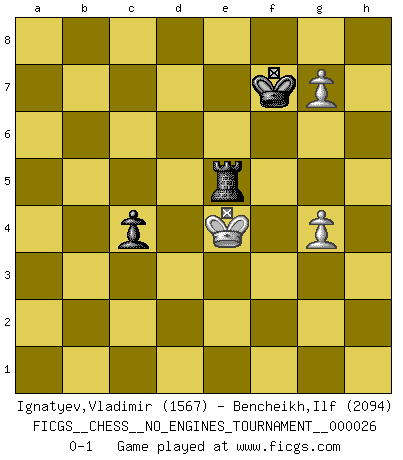 Last move : 0-1 2010 June 13 1:14:58 [Event "FICGS__CHESS__NO_ENGINES_TOURNAMENT__000026"] [Site "FICGS"] [Date "2010.03.01"] [Round "1"] [White "Ignatyev,Vladimir"] [Black "Bencheikh,Ilf"] [Result "0-1"] [WhiteElo "1567"] [BlackElo "2094"] 1.e4 e6 2.f4 d5 3.e5 c5 4.c3 Nc6 5.Bd3 g5 6.Qg4 h5 7.Qxg5 Qxg5 8.fxg5 Nxe5 9.Be2 Bg7 10.Nf3 Ne7 11.O-O Nf5 12.d3 Bd7 13.h4 Ng4 14.Bf4 e5 15.Bh2 e4 16.dxe4 dxe4 17.Nfd2 Nge3 18.Nxe4 Nxf1 19.Bxf1 O-O-O 20.Nbd2 Nxh4 21.Nd6+ Kc7 22.Nxf7 Kc8 23.Nd6+ Kc7 24.Nf5 Kc6 25.Nxh4 Bg4 26.Ndf3 b5 27.a4 b4 28.Ne5+ Bxe5 29.Bxe5 Rhg8 30.Bb5+ Kb6 31.Nf3 Bxf3 32.Bf6 Rd1+ 33.Rxd1 Bxd1 34.Bc4 Re8 35.g6 bxc3 36.Bxc3 Bc2 37.a5+ Kc7 38.Bf7 Rd8 39.g7 Bh7 40.Bxh5 Bg8 41.Bf3 Kd6 42.g4 Bd5 43.Be2 Re8 44.Kf2 Bg8 45.Bd3 Kc6 46.Kf3 Rd8 47.Be4+ Kd6 48.Kf4 Re8 49.Bf5 Re2 50.Kg5 Ke7 51.Bd3 Rf2 52.b3 Rf3 53.Bc4 Bxc4 54.bxc4 Kf7 55.Be5 Ra3 56.Kf5 Ra4 57.a6 Rxc4 58.Bb8 Ra4 59.Bxa7 Rxa6 60.Bb8 c4 61.Be5 Ra5 62.Ke4 Rxe5+ 0-1 French : Labourdonnais variation Kingside Castling by player White (move 11) Queenside Castling by player Black (move 19) 10 pieces endgame at move 54 : White KBPPPP , Black KRPP WHITE : King + 1 Bishop 4 Pawns BLACK : King + 1 Rook 2 Pawns 9 pieces endgame at move 57 : White KBPPP , Black KRPP WHITE : King + 1 Bishop 3 Pawns BLACK : King + 1 Rook 2 Pawns 8 pieces endgame at move 59 : White KBPPP , Black KRP WHITE : King + 1 Bishop 3 Pawns BLACK : King + 1 Rook 1 Pawn 7 pieces endgame at move 59 : White KBPP , Black KRP WHITE : King + 1 Bishop 2 Pawns BLACK : King + 1 Rook 1 Pawn 6 pieces endgame at move 62 : White KPP , Black KRP WHITE : King + 2 Pawns BLACK : King + 1 Rook 1 Pawn Player Black won this chess game. Follow this game move after move (download)Chess is war over the board. The object is to crush the opponents mind. (Bobby Fischer) Wer mein Gambit spielt, muß bereit sein, alle Brücken hinter sich abzubrechen. Es verändert den ganzen Menschen. Es wirkt wie ein Zauberstab und fördert verkümmerte, gute Charakter- eigenschaften wieder zu Tage. (Emil Joseph Diemer) Realmente no sabemos como el juego fue inventado, aunque hay sospechas. Tan pronto como descubramos a los culpables, se los haremos saber. (Bruce Pandolfini) À la honte des hommes, on sait que les lois du jeu sont les seules qui soient partout justes, claires, inviolables et exécutées. Pourquoi l'Indien qui a donné les règles du jeu d'échecs est-il obéi de bon gré dans toute la terre, et que les décrétales des papes, par exemple, sont aujourd'hui un objet d'horreur et de mépris ? C'est que l'inventeur des échecs combina tout avec justesse pour la satisfaction des joueurs, et que les papes, dans leurs décrétales, n'eurent en vue que leur seul avantage. L'Indien voulut exercer également l'esprit des hommes et leur donner du plaisir; les papes ont voulu abrutir l'esprit des hommes. Voltaire (Dictionnaire philosophique / Garnier 1967) Drag your thoughts away from your troubles... by the ears, by the heels, or any other way you can manage it. (Mark Twain)