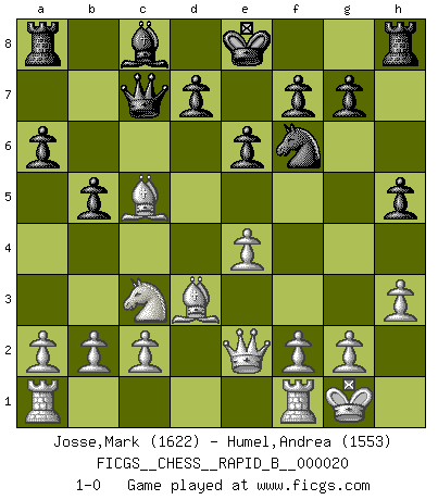 Last move : 1-0 2006 December 7 5:15:22 [Event "FICGS__CHESS__RAPID_B__000020"] [Site "FICGS"] [Date "2006.10.17"] [Round "1"] [White "Josse,Mark"] [Black "Humel,Andrea"] [Result "1-0"] [WhiteElo "1622"] [BlackElo "1553"] 1.e4 c5 2.Nf3 e6 3.d4 cxd4 4.Nxd4 a6 5.Nc3 Qc7 6.Be3 Nf6 7.Bd3 Nc6 8.O-O h5 9.h3 b5 10.Qe2 Nxd4 11.Bxd4 Bc5 12.Bxc5 1-0 This chess game has been lost on time (started : 2006.10.17 19:12:14) Sicilian : Kan, 5.Nc3 Kingside Castling by player White (move 8) Player White won this chess game. Follow this game move after move (download)Winning isn't everything... but losing is nothing. (Mednis) Schach ist ein Kampf gegen den Fehler. (Johannes Herrman Zukertort) Es muy difícil jugar en contra de la teoría de Einstein. - en su primera derrota en contra de Fischer (Mikhail Tal) Il n'y a plus de joueurs du niveau de Jacob Murray dont la seule quête est le beau jeu, le plaisir de voir les pièces construire quelque chose. Sur 10 idées à la minute, 9 seront sans intérêt, la dernière s'avèrera géniale. (Christian Bauer) A specialist learns more and more about less and less until he knows everything about nothing. (Nicholas Murray Butler)
