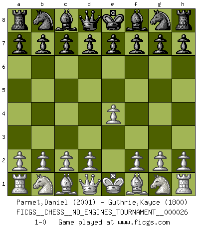 Last move : 1-0 2010 April 10 20:50:19 [Event "FICGS__CHESS__NO_ENGINES_TOURNAMENT__000026"] [Site "FICGS"] [Date "2010.03.01"] [Round "1"] [White "Parmet,Daniel"] [Black "Guthrie,Kayce"] [Result "1-0"] [WhiteElo "2001"] [BlackElo "1800"] 1.e4 1-0 This chess game has been lost on time (started : 2010.03.01 18:4:9) King's pawn Opening Player White won this chess game. Follow this game move after move (download)All I want to do, ever, is just play Chess. (Bobby Fischer) Je mehr ich von der FIDE weiss, um so weniger verstehe ich. (Alexander Kalifman) El pensamiento metódico es mas útil en el Ajedrez que la inspiración. (C. J. S. Purdy) À la honte des hommes, on sait que les lois du jeu sont les seules qui soient partout justes, claires, inviolables et exécutées. Pourquoi l'Indien qui a donné les règles du jeu d'échecs est-il obéi de bon gré dans toute la terre, et que les décrétales des papes, par exemple, sont aujourd'hui un objet d'horreur et de mépris ? C'est que l'inventeur des échecs combina tout avec justesse pour la satisfaction des joueurs, et que les papes, dans leurs décrétales, n'eurent en vue que leur seul avantage. L'Indien voulut exercer également l'esprit des hommes et leur donner du plaisir; les papes ont voulu abrutir l'esprit des hommes. Voltaire (Dictionnaire philosophique / Garnier 1967) God is an atheist. (Unknown)