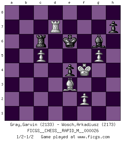 Last move : 1/2-1/2 2010 August 26 18:12:1 [Event "FICGS__CHESS__RAPID_M__000026"] [Site "FICGS"] [Date "2010.03.02"] [Round "1"] [White "Gray,Garvin"] [Black "Wosch,Arkadiusz"] [Result "1/2-1/2"] [WhiteElo "2133"] [BlackElo "2173"] 1.d4 Nf6 2.c4 e6 3.Nc3 Bb4 4.Nf3 d5 5.cxd5 exd5 6.Bg5 Nbd7 7.e3 c5 8.Qc2 Qa5 9.Bd3 c4 10.Bf5 O-O 11.O-O Re8 12.Nd2 g6 13.Bxd7 Nxd7 14.e4 Bxc3 15.Qxc3 Qxc3 16.bxc3 dxe4 17.Nxc4 b6 18.Rfe1 Ba6 19.Nd6 Re6 20.Bf4 f5 21.h4 Rd8 22.c4 Nf6 23.c5 Nd5 24.Bg5 Rd7 25.Rac1 Nb4 26.Rc3 Bd3 27.Bh6 Rd8 28.Rd1 Rd7 29.a4 Na2 30.Ra3 Nb4 31.Rc1 Nc2 32.Rb3 g5 33.Nxf5 gxh4 34.Be3 bxc5 35.dxc5 Rc6 36.Rc3 Nb4 37.Nd4 Rxd4 38.Bxd4 Na2 39.Kh2 Nxc3 40.Rxc3 Kf7 41.Rb3 Rc7 42.Kh3 Bc2 43.Rb4 a5 44.Rb5 Bxa4 45.Rxa5 Bc6 46.Be3 Ke6 47.Ra6 Kd5 48.Kxh4 Rf7 49.Ra1 Rg7 50.Rd1+ Kc4 51.g4 Kb5 52.Rd6 Rg6 53.Rd8 Re6 54.g5 Be8 55.Rb8+ Kc6 56.Kg4 Bg6 57.Rd8 Kc7 58.Ra8 Kb7 59.Ra1 Rc6 60.Kf4 Re6 61.Ra3 Kc6 62.Ra7 Kd5 63.Ra2 Rc6 64.Ra1 Ke6 65.Ra7 Kd5 66.Rd7+ Ke6 1/2-1/2 Nimzo-Indian : Three knights variation Kingside Castling by player Black (move 10) Kingside Castling by player White (move 11) This chess game ended in a draw. Follow this game move after move (download)The essence of Chess is thinking about what Chess is. (David Bronstein) Ich habe Kasparov in Rente geschickt. (Veselin Topalov) Una de estas pequeñas movidas modestas pudieran ser mas molestas a tu oponente que la amenaza mas grande. (Siegbert Tarrasch) Roi des jeux et jeu des rois, les échecs portent en eux un sentiment d'infini. Ils donnent à celui qui s'est efforcé d'en approfondir les arcanes l'impression de n'être pas à la mesure de l'homme; en fait, ils constituent un résumé de l'univers, un microcosme, et figurent cette grande échelle qui, dans les plans de la lumière descend jusqu'à la matière, qui des abîmes insondables remonte jusqu'en l'infini de Dieu. (Pyrame) Sometimes it pays to stay in bed in Monday, rather than spending the rest of the week debugging Monday's code. (Dan Salomon)