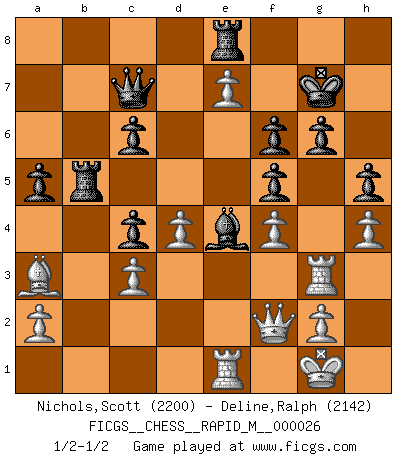 Last move : 1/2-1/2 2010 March 25 9:26:46 [Event "FICGS__CHESS__RAPID_M__000026"] [Site "FICGS"] [Date "2010.03.02"] [Round "1"] [White "Nichols,Scott"] [Black "Deline,Ralph"] [Result "1/2-1/2"] [WhiteElo "2200"] [BlackElo "2142"] 1.e4 c5 2.Nc3 Nc6 3.f4 g6 4.Nf3 Bg7 5.h3 d6 6.Bb5 Nf6 7.O-O O-O 8.Bxc6 bxc6 9.d3 Rb8 10.Qe1 Ne8 11.Qh4 Nc7 12.Ng5 h6 13.Nf3 f5 14.e5 Be6 15.Qf2 Nd5 16.Re1 Nxc3 17.bxc3 Bd5 18.Nh4 Bf7 19.c4 Qc7 20.Nf3 Qb6 21.Nd2 Qc7 22.Qe2 Be6 23.Nb3 Rfe8 24.Bb2 Qb6 25.Rab1 Qc7 26.Qd2 Kh7 27.Re3 Bg8 28.Rbe1 d5 29.Ba3 dxc4 30.Nxc5 Qd8 31.d4 a5 32.c3 Bd5 33.e6 Qd6 34.R3e2 Rb5 35.Qc1 Qb8 36.Nd7 Qc7 37.Qe3 Be4 38.Qf2 Bd3 39.Re3 Bb1 40.Rg3 Bf6 41.Nxf6+ exf6 42.e7 Be4 43.Rge3 Kg7 44.h4 h5 45.Rg3 1/2-1/2 Sicilian : Grand Prix attack Kingside Castling by player White (move 7) Kingside Castling by player Black (move 7) This chess game ended in a draw. Follow this game move after move (download)Adequate compensation for a sacrifice is having a sound combination leading to a winning position; adequate compensation for a blunder is having your opponent snatch defeat from the jaws of victory. (Bruce A. Moon) Der Umstand, daß uns eine 7 Stunden Zeitkontrolle ermöglicht eine großartige, tiefe Partie zu spielen, ist für die Massenmedien nicht weiter von Bedeutung. (Alexej Shirov) Después de la respuesta de las negras a 1.e4 con 1..e5, se quedan siempre tratando de entrar dentro del juego. (Howard Staunton) Vous n'êtes pas toujours obligé de jouer le meilleur coup. Un coup doit être actif, entreprenant, correct et beau ! (David Bronstein) Philosophers use a language that is already deformed as though by shoes that are too tight. (Ludwig Wittgenstein)