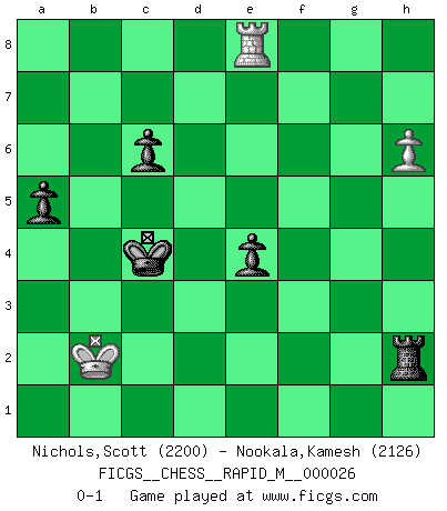 Last move : 0-1 2010 April 25 20:5:47 [Event "FICGS__CHESS__RAPID_M__000026"] [Site "FICGS"] [Date "2010.03.02"] [Round "1"] [White "Nichols,Scott"] [Black "Nookala,Kamesh"] [Result "0-1"] [WhiteElo "2200"] [BlackElo "2126"] 1.e4 c5 2.Nc3 d6 3.f4 Nc6 4.Nf3 g6 5.h3 Bg7 6.g4 e6 7.Bg2 Nd4 8.d3 Bd7 9.f5 exf5 10.exf5 Bc6 11.O-O gxf5 12.Qe1+ Ne7 13.Nxd4 Bxd4+ 14.Be3 Bxg2 15.Kxg2 Be5 16.Bf4 Qc7 17.Bxe5 dxe5 18.gxf5 O-O-O 19.Qe3 Nd5 20.Nxd5 Rxd5 21.Rf3 Rd4 22.Re1 f6 23.b3 a6 24.Rg3 Kb8 25.Re2 Ka7 26.a3 Re8 27.c3 Rd5 28.Qe4 Red8 29.a4 Qb6 30.Rb2 Qc6 31.Kf2 Rxd3 32.Qxc6 bxc6 33.Rg7+ R8d7 34.Rxd7+ Rxd7 35.Ke3 Kb6 36.Rg2 c4 37.bxc4 Kc5 38.Rg4 Rd1 39.Rh4 Rf1 40.Rxh7 Rxf5 41.h4 Rf4 42.Kd3 f5 43.Rh6 Rf3+ 44.Ke2 Rxc3 45.Rh5 Rxc4 46.Rxf5 Re4+ 47.Kd3 Kd5 48.h5 Rxa4 49.Rf8 Rh4 50.Rd8+ Kc5 51.Rh8 a5 52.h6 e4+ 53.Kc3 Rh3+ 54.Kb2 Kb4 55.Rb8+ Kc4 56.Re8 Rh2+ 0-1 Sicilian : Closed Kingside Castling by player White (move 11) Queenside Castling by player Black (move 18) 10 pieces endgame at move 45 : White KRPP , Black KRPPPP WHITE : King + 1 Rook 2 Pawns BLACK : King + 1 Rook 4 Pawns 9 pieces endgame at move 46 : White KRPP , Black KRPPP WHITE : King + 1 Rook 2 Pawns BLACK : King + 1 Rook 3 Pawns 8 pieces endgame at move 48 : White KRP , Black KRPPP WHITE : King + 1 Rook 1 Pawn BLACK : King + 1 Rook 3 Pawns Player Black won this chess game. Follow this game move after move (download)The most powerful weapon in Chess is to have the next move. (David Bronstein) Ja, ich habe einmal eine Blitzpartie gespielt, es war in einem Zug, 1929. --im Interview 1989 (Mikhail Moiseyevich Botvinik) Si el Ajedrez es una ciencia, es la mas inexacta. Si el Ajedrez es un arte, es demasiado inexacto para ser visto como tal. Si el Ajedrez es un deporte, es demasiado esotérico. Si el Ajedrez es un juego, es demasiado exigente para ser solo un juego. Si el Ajedrez es una aventura, es una muy demandante. Si el Ajedrez es una pasión, es una muy gratificante. Si el Ajedrez es la vida, es una muy triste. (Anónimo) Vous m'avez demandé de vous exposer quel est le fondement de la prière. Je ne fais que préparer les pièces du jeu sur la table... Nous sera-t-il permis d'en adopter les règles et si nous les appliquons scrupuleusement nous ne tarderons pas à faire mat le Roi divin ! Il ne pourra échapper à nos mains. (Sainte Thérèse d'Avila, Chemin de perfection) Depression is just anger without enthusiasm. (Unknown)