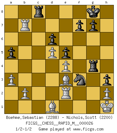 Last move : 1/2-1/2 2010 May 31 17:17:48 [Event "FICGS__CHESS__RAPID_M__000026"] [Site "FICGS"] [Date "2010.03.02"] [Round "1"] [White "Boehme,Sebastian"] [Black "Nichols,Scott"] [Result "1/2-1/2"] [WhiteElo "2288"] [BlackElo "2200"] 1.d4 d5 2.c4 Nc6 3.Nc3 dxc4 4.Nf3 Nf6 5.e4 Bg4 6.Be3 e6 7.Bxc4 Bb4 8.Qd3 a6 9.Nd2 e5 10.d5 Ne7 11.a3 Bd6 12.O-O Bd7 13.f3 Nh5 14.Ba2 Nf4 15.Qc2 Neg6 16.Kh1 h5 17.Nc4 h4 18.Na5 Rb8 19.Ne2 Nh5 20.Rf2 Qf6 21.Rc1 Ng3+ 22.Kg1 Nxe2+ 23.Qxe2 Nf4 24.Qd2 Rh6 25.Kh1 Ke7 26.Qd1 Rg6 27.Nc4 Kf8 28.Bb1 Bb5 29.Nxd6 cxd6 30.Qd2 Nh5 31.Rc7 Kg8 32.Ba7 Ra8 33.Bb6 Ng3+ 34.Kg1 Nh5 35.Bc2 Nf4 36.Kh1 a5 37.Be3 Rb8 38.Ba7 Ra8 39.Rxb7 Bf1 40.Rxf1 Rxg2 41.Rf2 h3 42.Be3 Qg5 43.Qe1 Rc8 44.Bd1 Nd3 45.Re2 Nxe1 46.Bxg5 Nxf3 47.Be3 Rg4 1/2-1/2 QGD : Chigorin defense, Janowski variation Kingside Castling by player White (move 12) This chess game ended in a draw. Follow this game move after move (download)Chess is a terrific way for kids to build self image and self esteem. (Saudin Robovic) Wir können eben der zündenden Macht des Opfers nicht wiederstehen, denn die Begeisterung für das Opfer liegt in der Natur des Menschen. (Rudolf Spielmann) Realmente no sabemos como el juego fue inventado, aunque hay sospechas. Tan pronto como descubramos a los culpables, se los haremos saber. (Bruce Pandolfini) Demandez au pauvre Cg1 ce qu'il en pense. Eduard Gufeld à propos de la variante Saemisch de l'Est-Indienne. Chess is everything: art, science and sport. (Anatoly Karpov)