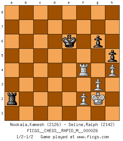 Last move : 1/2-1/2 2010 May 7 14:10:57 [Event "FICGS__CHESS__RAPID_M__000026"] [Site "FICGS"] [Date "2010.03.02"] [Round "1"] [White "Nookala,Kamesh"] [Black "Deline,Ralph"] [Result "1/2-1/2"] [WhiteElo "2126"] [BlackElo "2142"] 1.e4 c5 2.Nf3 Nc6 3.d4 cxd4 4.Nxd4 Nf6 5.Nc3 e5 6.Ndb5 d6 7.Bg5 a6 8.Na3 b5 9.Nd5 Be7 10.Bxf6 Bxf6 11.c3 Bg5 12.Nc2 O-O 13.a4 bxa4 14.Rxa4 a5 15.Bc4 Rb8 16.b3 Kh8 17.Nce3 g6 18.O-O f5 19.Qd3 Be6 20.R4a1 fxe4 21.Qxe4 Qd7 22.h3 Qf7 23.Ra2 Qb7 24.Rd1 Bd8 25.Qd3 Qf7 26.Kh1 Bg5 27.Nf1 Ne7 28.Nxe7 Bxe7 29.Bxe6 Qxe6 30.c4 Rb7 31.Ng3 Rfb8 32.Rb1 Bd8 33.Ne4 Bc7 34.Ra3 Rb4 35.Rd1 a4 36.bxa4 Qxc4 37.Qxc4 Rxc4 38.Nxd6 Rf4 39.a5 Rd8 40.a6 Bxd6 41.a7 R4f8 42.Ra6 Ra8 43.R1xd6 Rf7 44.Re6 R8xa7 45.Rxa7 Rxa7 46.Rxe5 Kg7 47.g3 Kf6 48.Re4 Ra2 49.Rf4+ Ke6 50.Kg2 h5 51.h4 1/2-1/2 Sicilian : Pelikan (Lasker/Sveshnikov) variation Kingside Castling by player Black (move 12) Kingside Castling by player White (move 18) 10 pieces endgame at move 45 : White KRPPP , Black KRPPP WHITE : King + 1 Rook 3 Pawns BLACK : King + 1 Rook 3 Pawns 9 pieces endgame at move 46 : White KRPPP , Black KRPP WHITE : King + 1 Rook 3 Pawns BLACK : King + 1 Rook 2 Pawns This chess game ended in a draw. Follow this game move after move (download)Good offense and good defense both begin with good development. (Bruce A. Moon) Im Fernschach kannst du während dem Spiel rauchen. (John Christen Knudsen) El Ajedrez no es como la vida... ¡tiene reglas!. (Mark Pasternak) Assurément je connaissais par expérience le mystérieux attrait de ce jeu royal, le seul entre tous les jeux inventés par les hommes qui échappe souverainement à la tyrannie du hasard, le seul où l'on ne doive sa victoire qu'à son intelligence ou plutôt à une certaine forme d'intelligence. Mais n'est-ce pas déjà le limiter injurieusement que d'appeler les échecs un jeu ? N'est-ce pas une science, un art ou quelque chose qui, comme le cercueil de Mahomet entre ciel et terre, est suspendu entre l'un et l'autre, et qui réunit un nombre incroyable de contraires ? [...] C'est une pensée qui ne mène à rien, une mathématique qui n'établit rien, un art qui ne laisse pas d'uvre, une architecture sans matière; et il l'a prouvé néanmoins qu'il était plus durable, à sa manière, que les livres ou que tout autre monument, ce jeu unique qui appartient à tous les peuples et à tous les temps, et dont personne ne sait quel dieu en fit don à la terre pour tuer l'ennui, pour aiguiser l'esprit et stimuler l'âme. Où commence-t-il, où finit-il ? (Stefan Zweig) Perseverance does not equal worthiness. Next time you want to get my attention, wear something fun. Low-riding jeans are hot. (Gregory House, House M.D.)